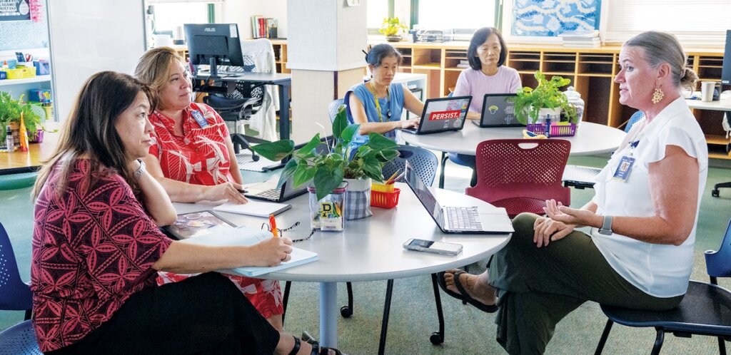 Punahou’s faculty members are receiving essential professional development and technology to help them understand the strategic use of AI. Pictured above, educators attend a workshop on how to optimize prompt commands – to make AI outputs more accurate and faster.
