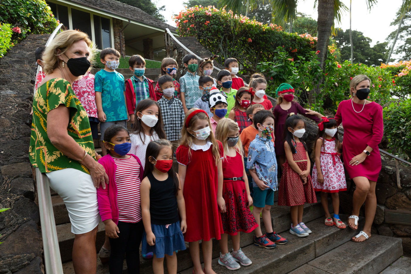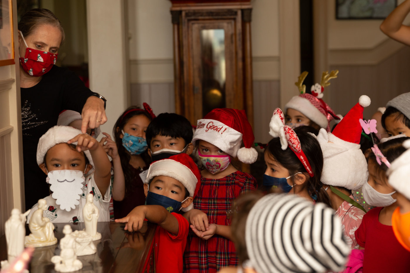 As part of a cherished holiday tradition, kindergartners enjoyed their visit this week to the President’s home. Each class had a chance to gather around the Christmas tree to hear President Mike Latham ’86 read the children’s book, “Who Will Pull Santa’s Sleigh?” His wife, Jennifer, then showed students her nativity set and told the story of Jesus’ birth on Christmas. As a special treat, the children received buff-and-blue popcorn to celebrate the occasion.
