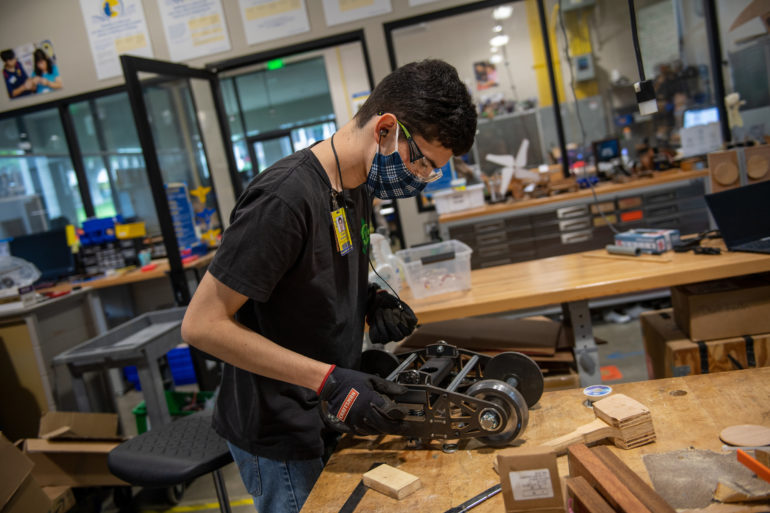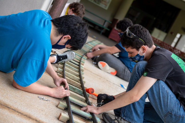 Academy engineering students fabricated and assembled a miniature train and 250-foot track in the D. Kenneth Richardson ’48 Learning Lab. The battery-powered and solar-charged replica of a steel locomotive can be set up at events to inspire an interest in engineering. “The train has been designed and built to be compatible with other tracks all over the world,” said Ed Kinnear, Academy Design Technology and Engineering faculty member, who is guiding students on the project.