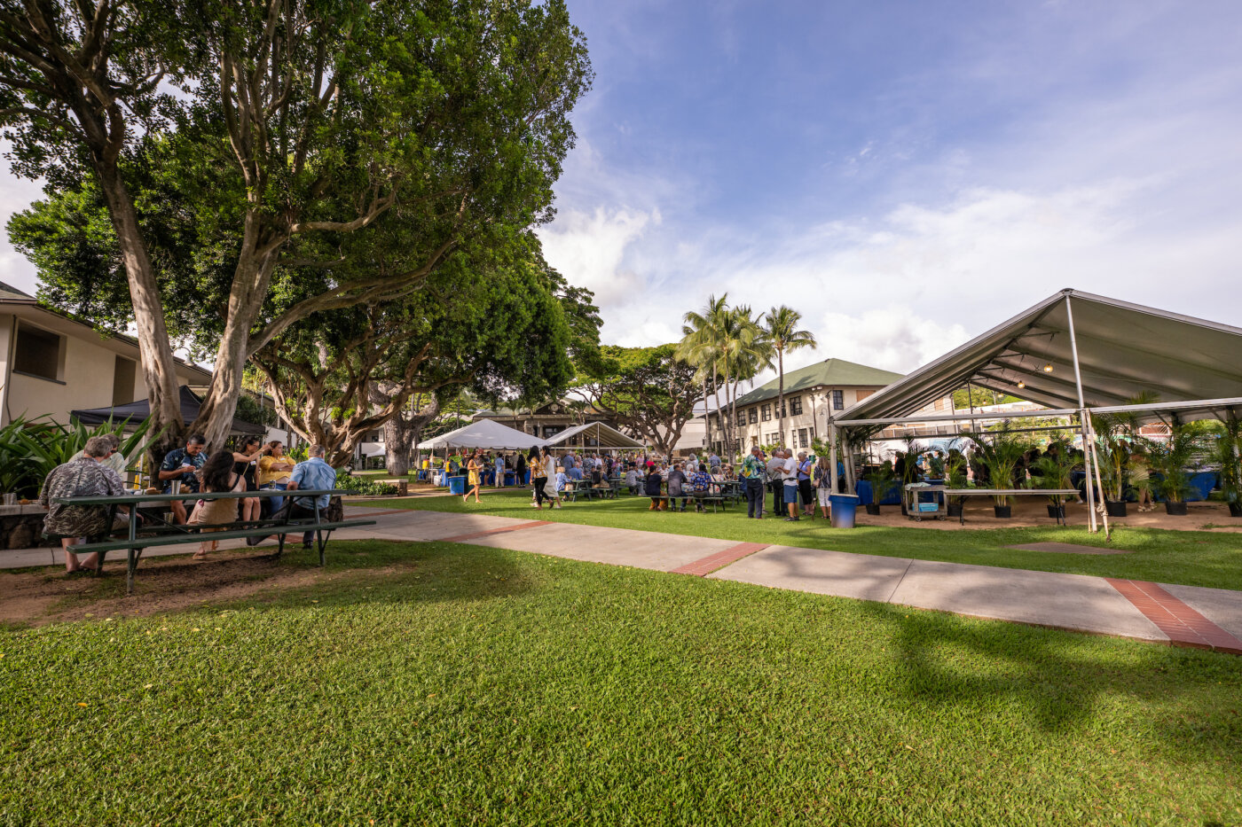 At Thursday’s E Ho‘i Mai Alumni Celebration, Punahou alumni from across the decades gathered in the Academy Quad for an evening of connection and celebration, featuring delicious food, refreshing drinks, and live music by talented alumni performers – all part of Alumni Week.