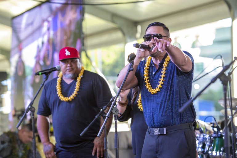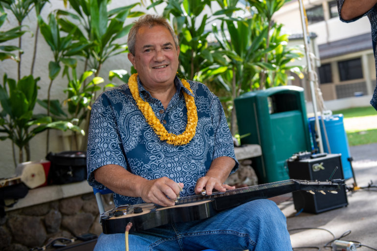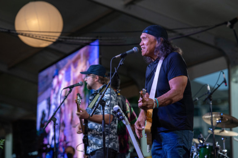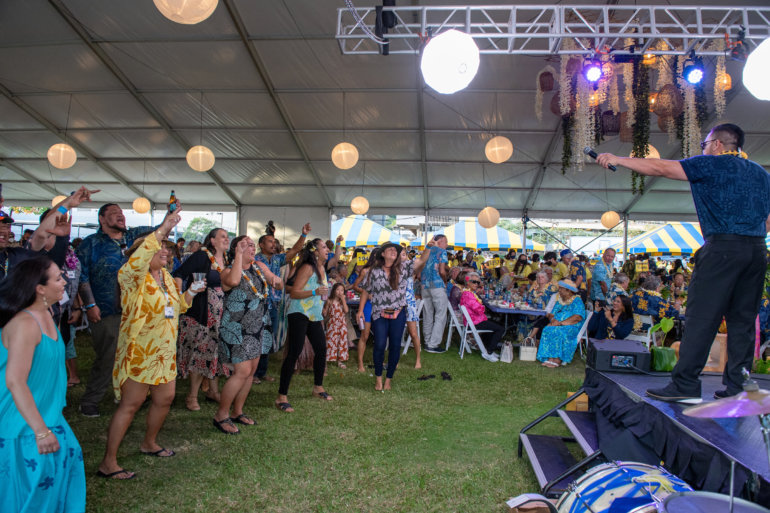 Guests enjoyed Hawaiian food prepared by the Imu Gang Emeritus, Dole Hall staff and Reppun Farms and entertainment from Ke‘olu, Kualoa, Danny “Kaniala” Makainai ’97 and friends, and the evening’s crowd-rousing headliner, Henry Kapono ’67.