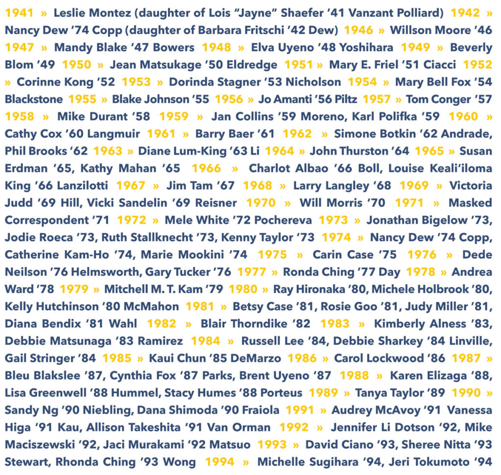 Mahalo to our Class Correspondents – past and present – for your steadfast dedication to your classmates and community. Your time, energy, words and wit bring the Alumni Notes to life in every issue of the Punahou Bulletin. The depth of your commitment keeps our buff ‘n blue alumni world engaged and connected. Here’s to another 100 years of Alumni Notes!
