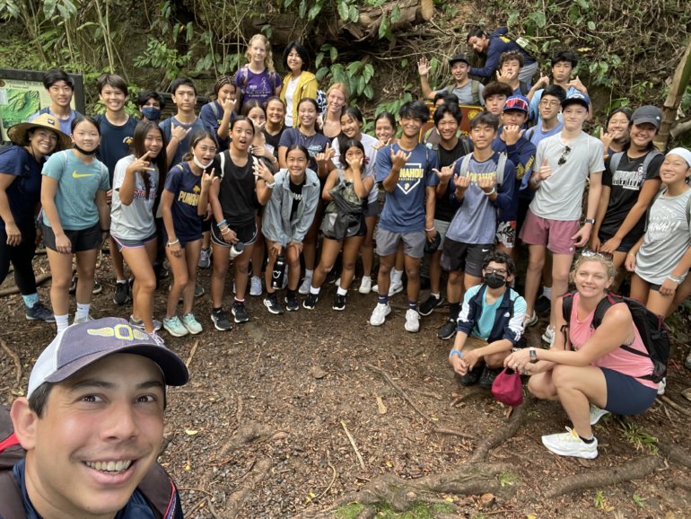 Meanwhile, the seniors filmed scenes for the finale of the Varsity Show, which will premiere at the Punahou Carnival, and took their place to form the “23” for their class yearbook photo.