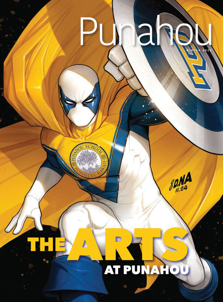 This issue was inspired by the evolution of artistic expression at Punahou since its founding in 1841. The cover was created by David Nakayama ’97, an acclaimed artist known for his work with DC and Marvel Comics. Cox appreciates the piece not only for its visual impact but also because it broke new ground. It is believed to be the first time a superhero was featured on the cover of the Punahou Bulletin.