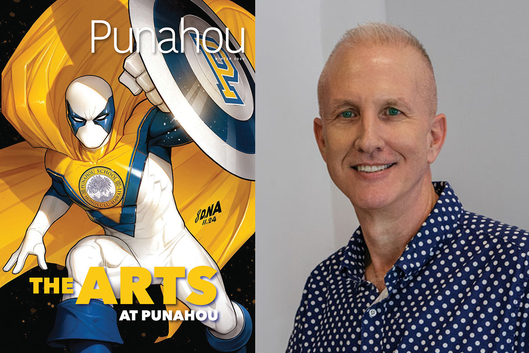 This issue was inspired by the evolution of artistic expression at Punahou since its founding in 1841. The cover was created by David Nakayama ’97, an acclaimed artist known for his work with DC and Marvel Comics. Cox appreciates the piece not only for its visual impact but also because it broke new ground. It is believed to be the first time a superhero was featured on the cover of the Punahou Bulletin.