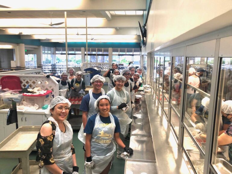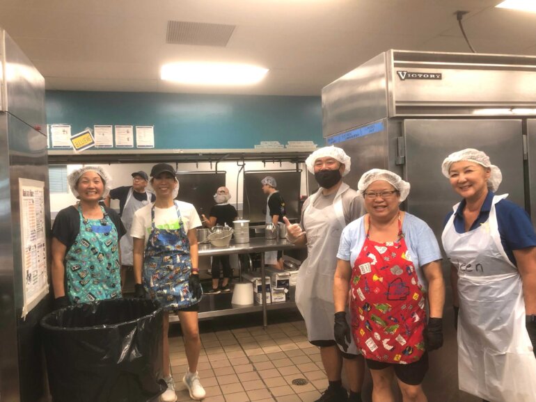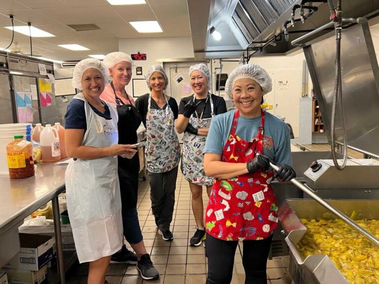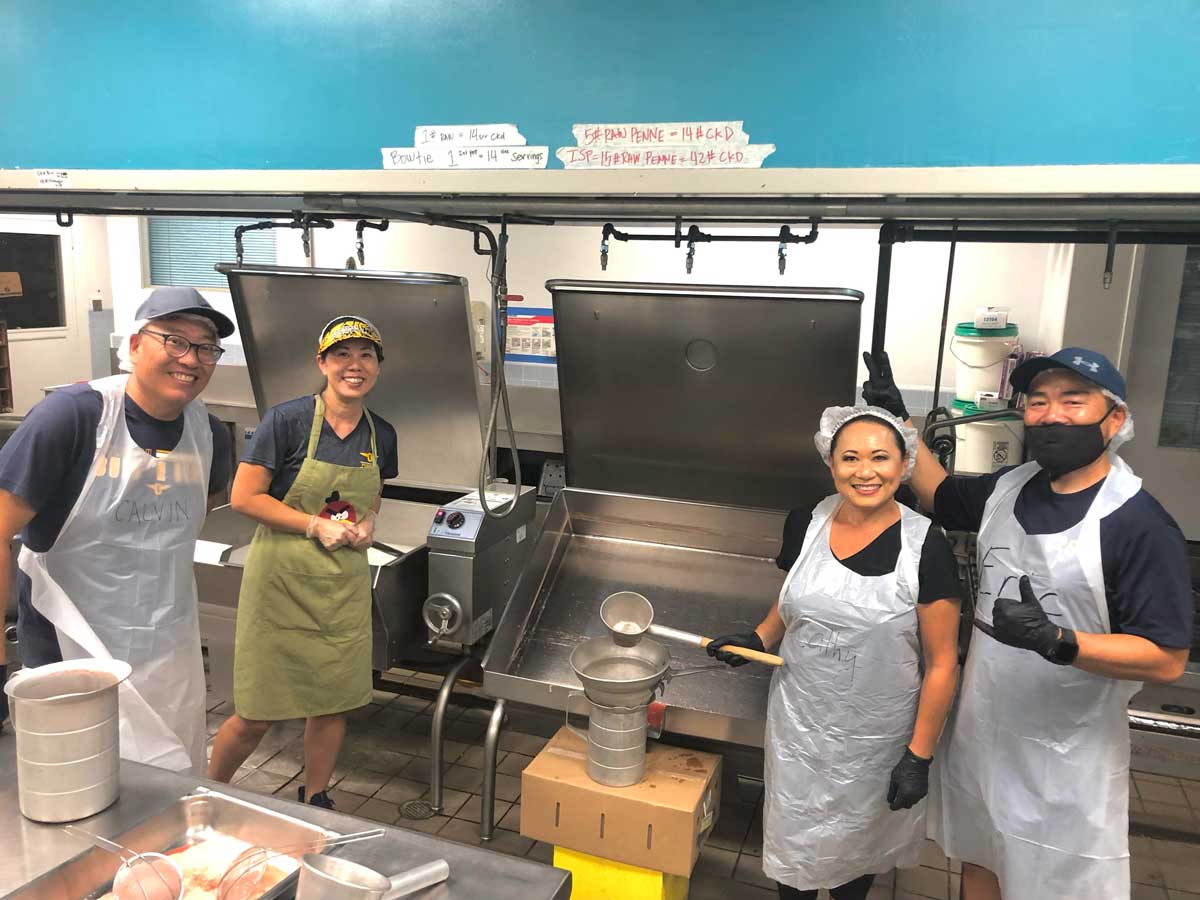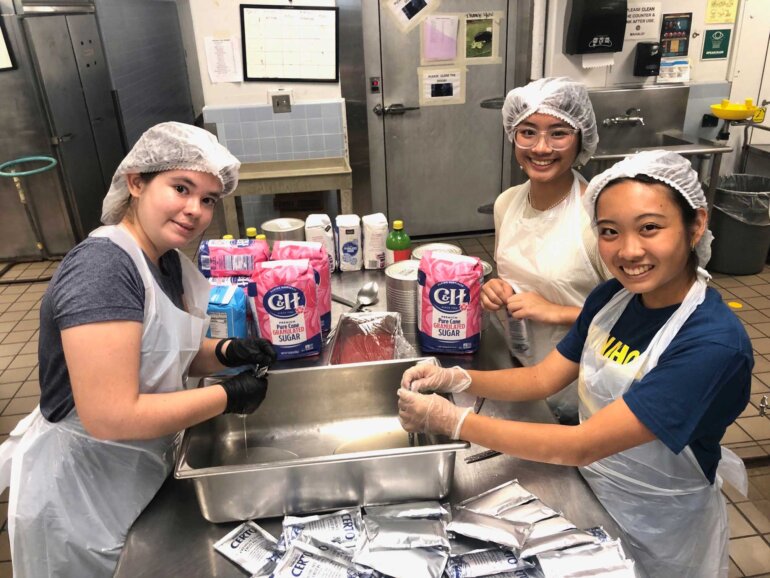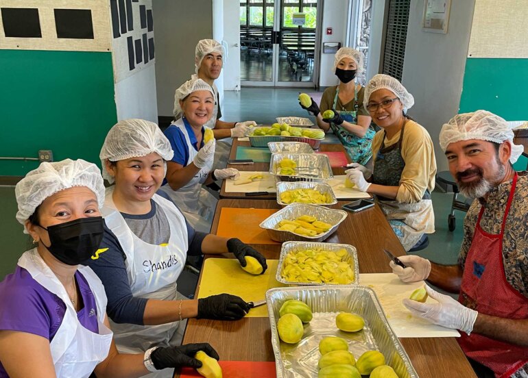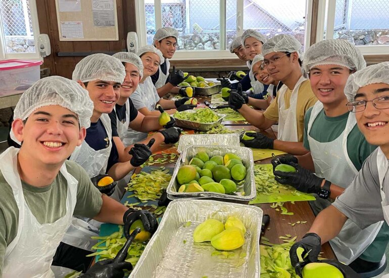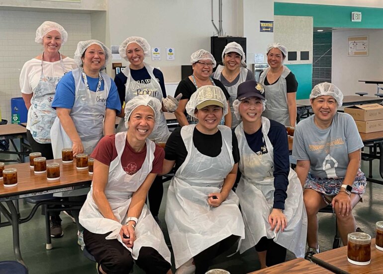 Jams and Jellies sessions are different from volunteering at one of the fast-paced Carnival shifts. We had time to connect with fellow parents and make new friends while sitting at the table chipping mangoes (cutting them into chip-sized pieces), or flipping and wiping jars as they cooled down. As non-alumni parents, Robert and I were able to make our own memories at Punahou as Jams and Jellies Booth Chairs. We experienced firsthand the incredible support of the Punahou family. We are so grateful to have been a part of supporting our son and his classmates’ Carnival.