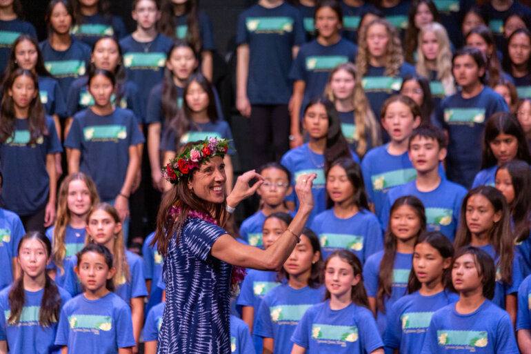 The resonant voices of 300 singers from grades 6 – 8 filled Dillingham Hall during the inaugural Kapuana Choral Festival, a celebration of Punahou’s Case Middle School Choral Program. “The Festival is a special way for us to share and celebrate through music what it means to be part of the Punahou community,” says Alicia Scanlan, head of the Junior School Music Department. The festival was inspired by Punahou’s new mission statement, which was unveiled in 2023, reinforcing the core values of discovery, purpose and inclusivity for the community.