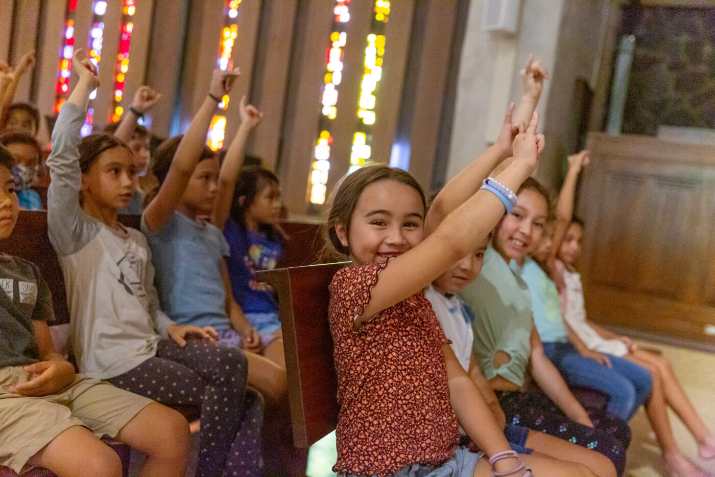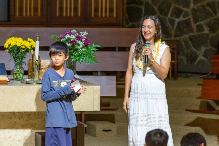 Malia Maunakea, children’s author of “Lei and the Fire Goddess,” delighted third and fourth graders during a visit to Punahou on Wednesday in the Chapel. Maunakea’s book, infused with the moʻolelo of the Islands, tells the tales of Anna, a 12-year-old part-Hawaiian girl.