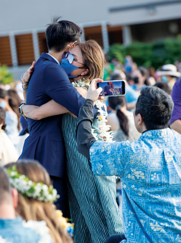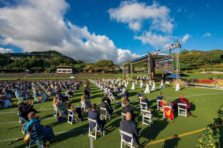 A covered stage was set up on one side of the field, facing a sea of seats for graduates and their parents. Although pandemic protocols were in place, requiring students to wear face coverings and remain socially distant, the graduates were able to sing and dance hula together, and receive their diplomas with their parents watching.