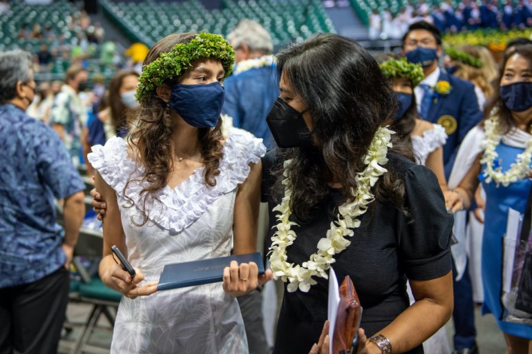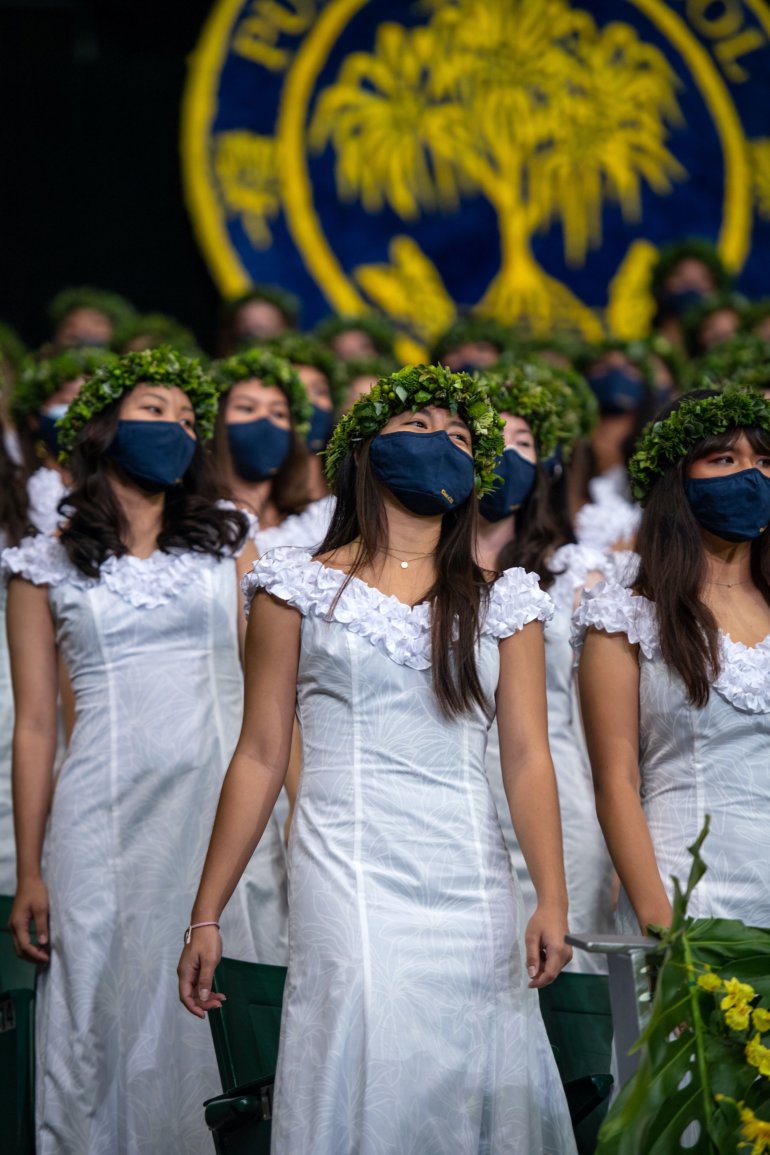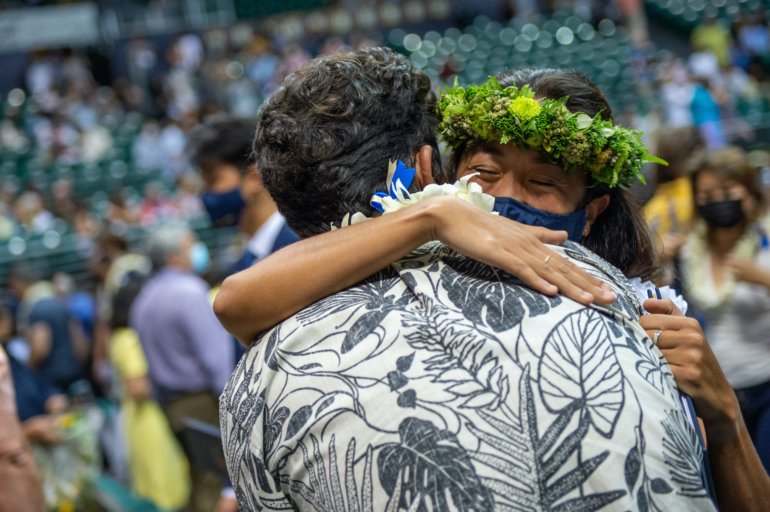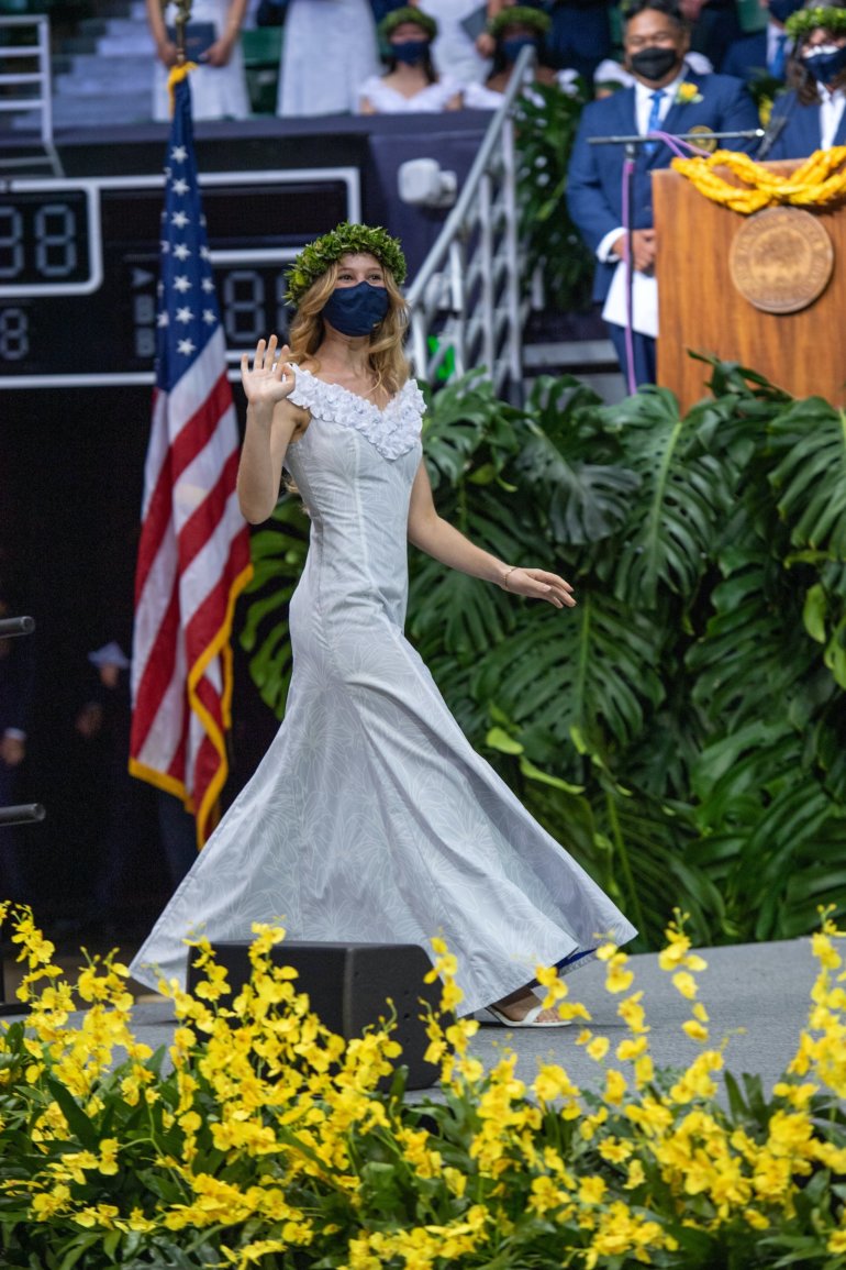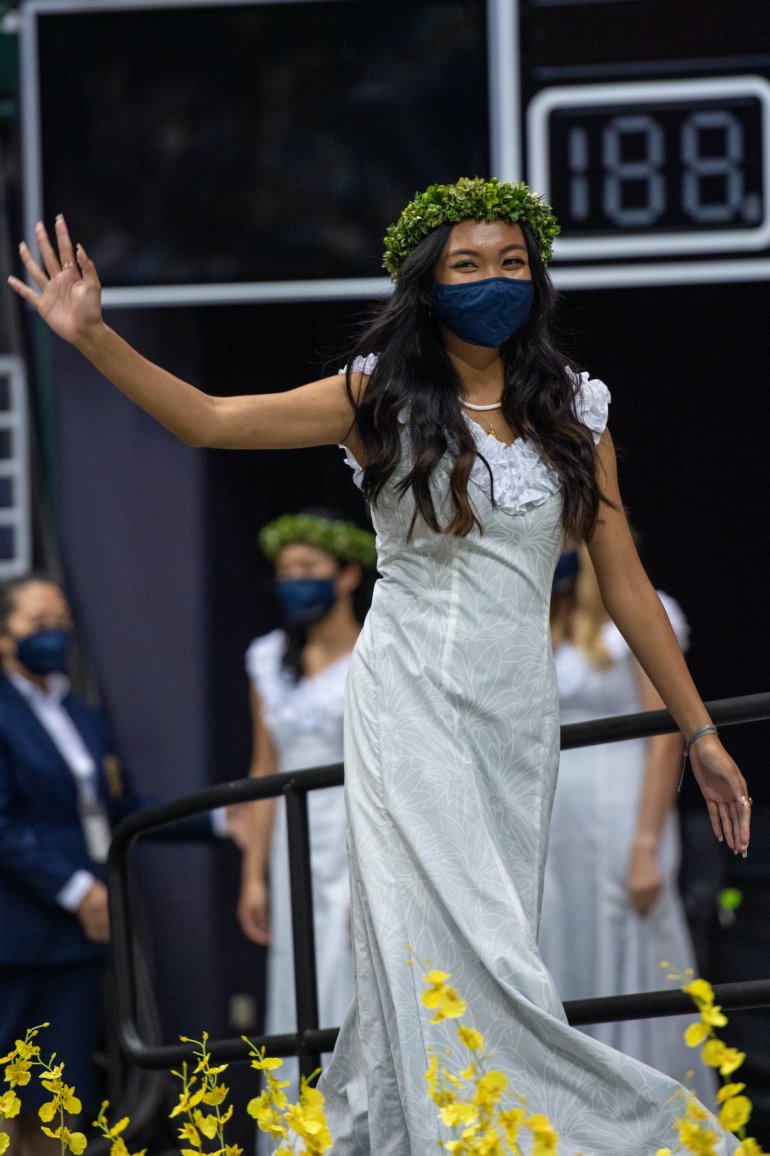 The ceremony ended with the class singing “O‘ahu a” followed up by a spirited “Strawberry Shortcake.” In a heartwarming moment, seniors gave lei and hugs to their family members who were seated in the audience, before exiting to greet guests outside.