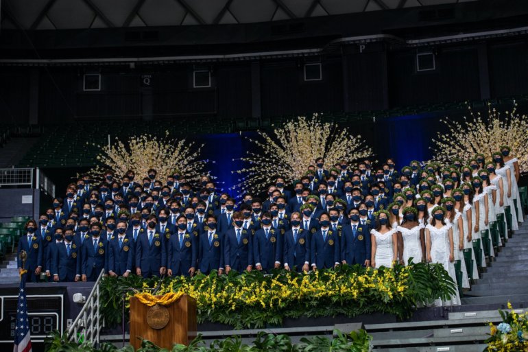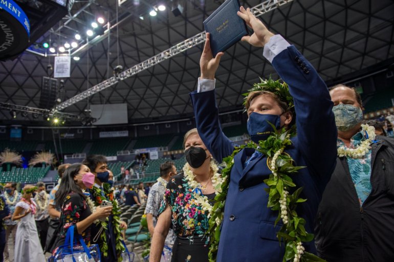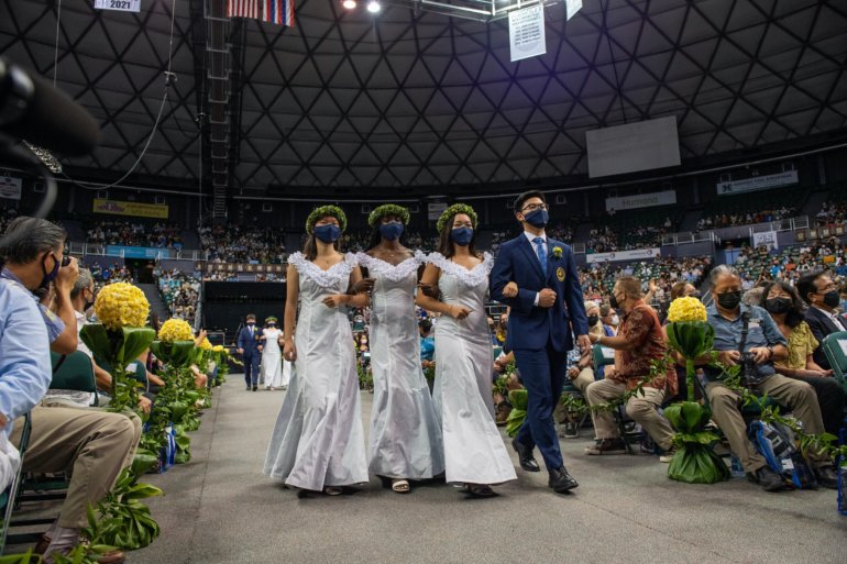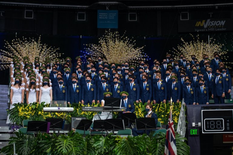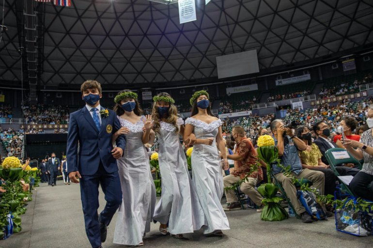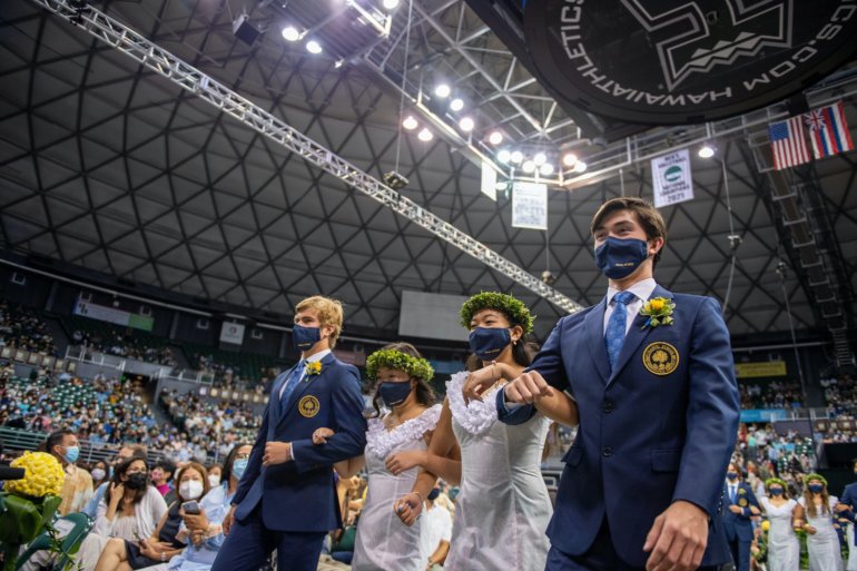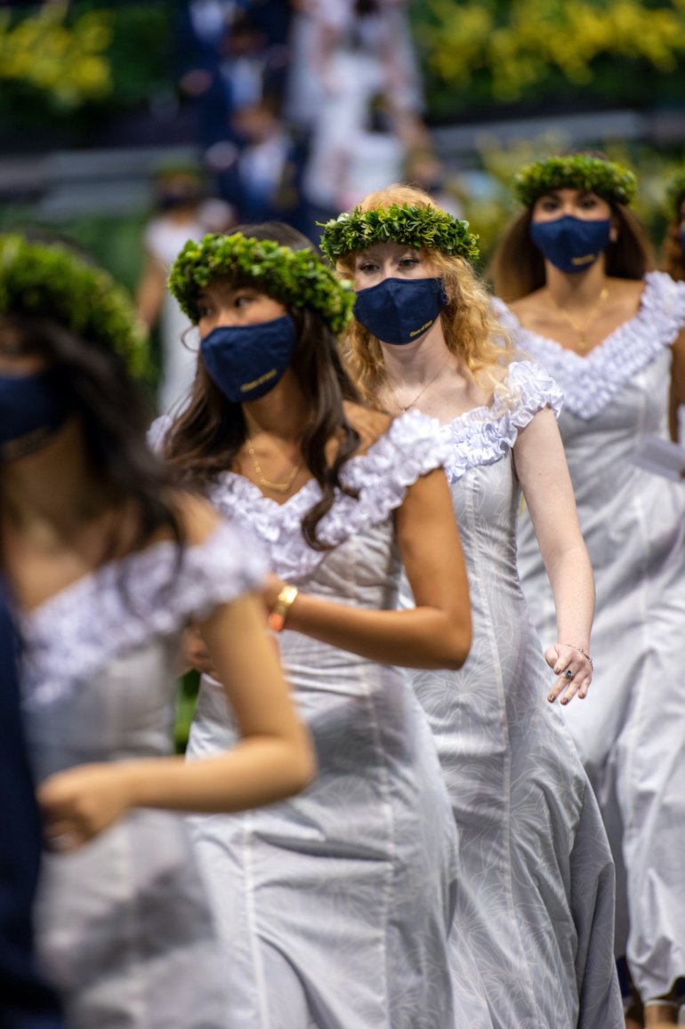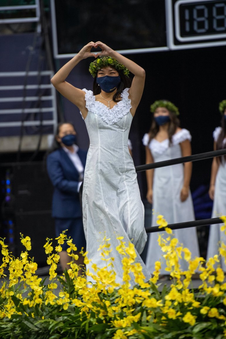 The ceremony ended with the class singing “O‘ahu a” followed up by a spirited “Strawberry Shortcake.” In a heartwarming moment, seniors gave lei and hugs to their family members who were seated in the audience, before exiting to greet guests outside.