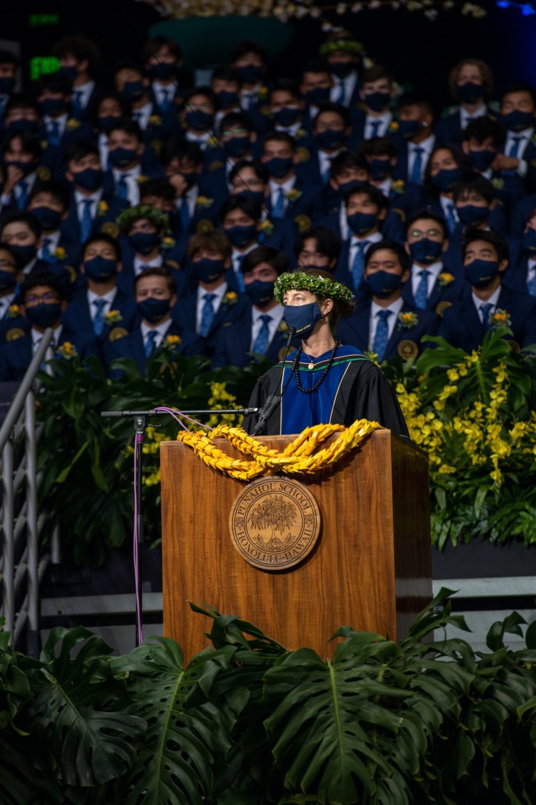 Academy Principal Emily McCarren highlighted the incredible strength of the class in her address, sharing how the seniors managed to express gratitude even in the face of challenges. “These students, over and over again, showed us how much there is to learn – and how to find joy – in challenge and hardship,” she said. “The last few years have presented enough challenges for a lifetime, and this was just high school for them. They have known no other reality and they have come out of these years hardened, and strong.” It was a wonderful farewell to the class before McCarren departs Punahou to head Keystone Academy in Beijing.