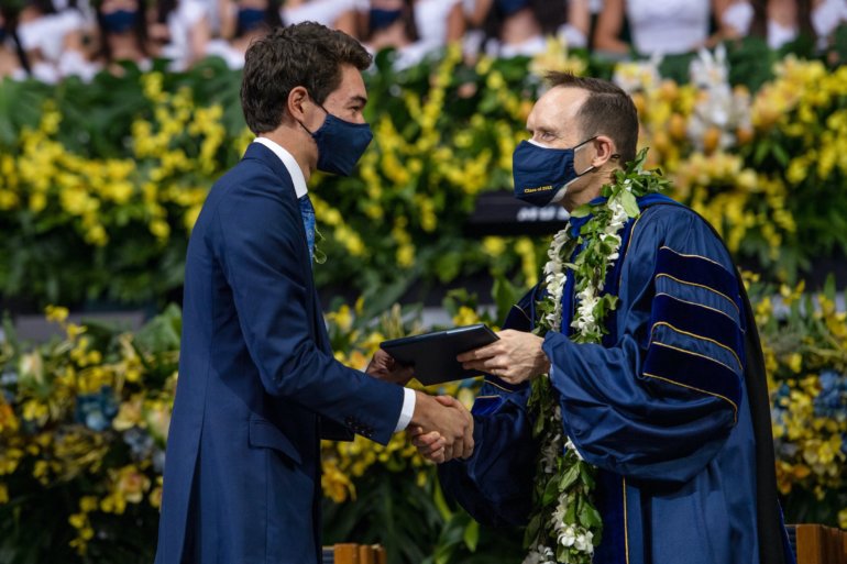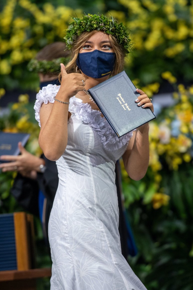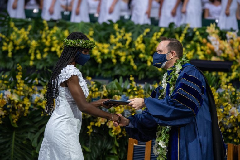 After the speeches, Deans Christine David and Jonah Ka‘akua ’97 presented the Class of 2022, with each member walking up on stage to receive their diploma.