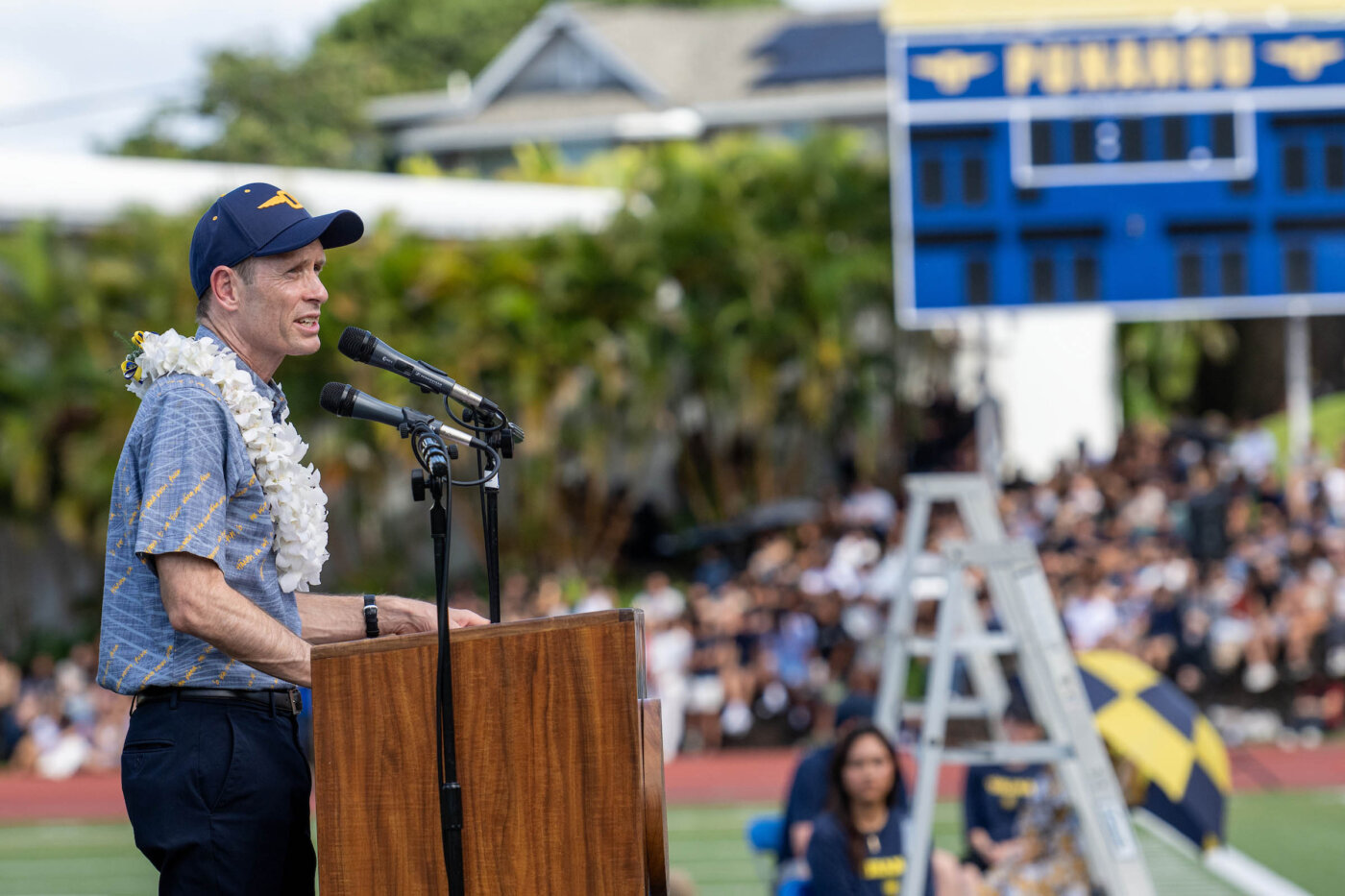 The event featured speeches from President Mike Latham ’86, Board of Trustees Chair David Carey, Junior School Principal Todd Chow-Hoy, Academy Principal Gustavo Carrera and Senior Class President Vincent Saito ’26. Chaplain Luana Uluave opened the morning with a blessing, weaving this year’s Chapel theme, ‘Auamo Kuleana – “embracing responsibility” – into her message.