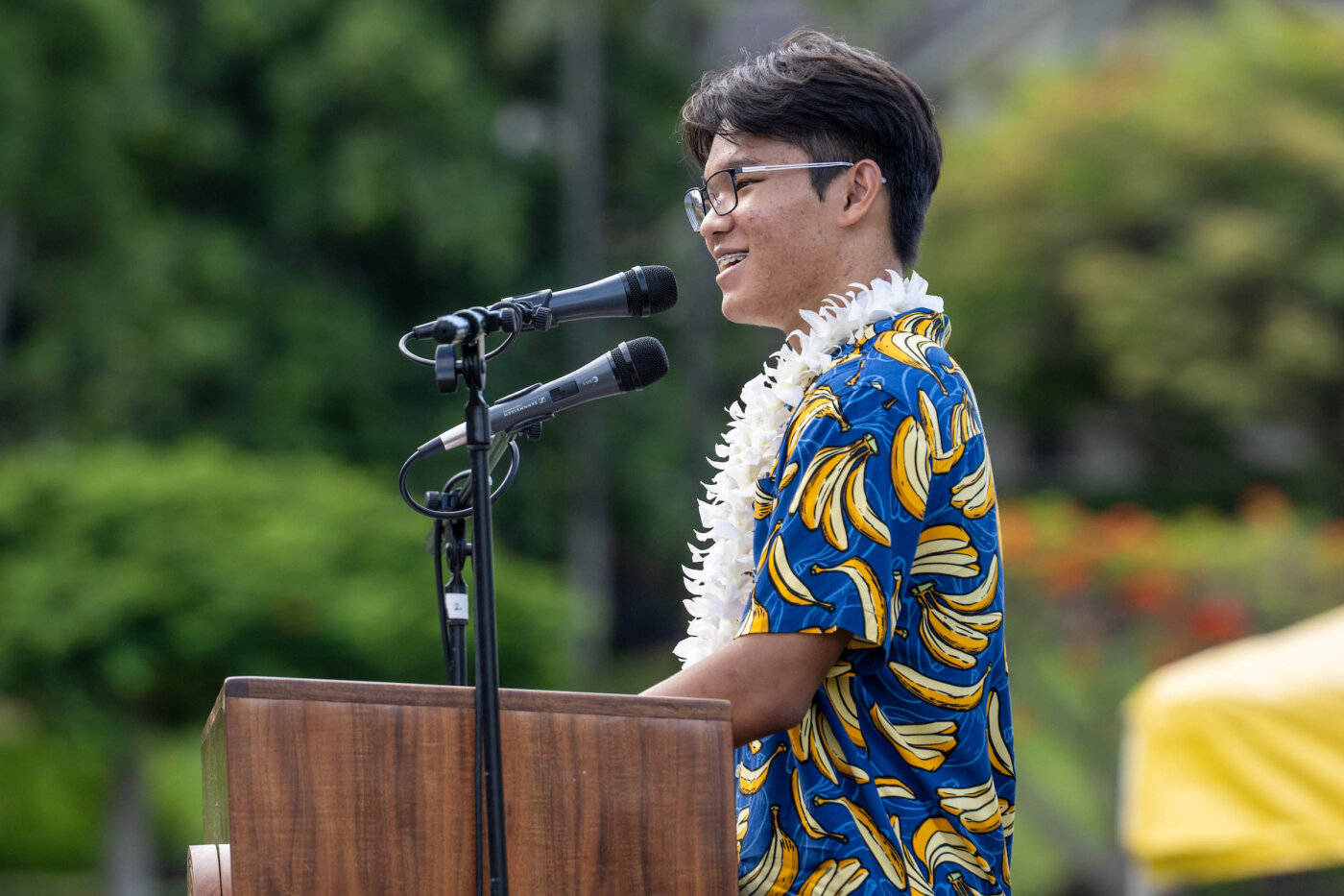 He also urged students to give their all, ask bold questions and seek meaning in all they do. President Latham inspired them to bring others along on their journey and welcome new students as well. “You have it within your power to enhance the experience and the lives of everybody you come into contact with,” he noted. He concluded his speech by expressing his hope that students carry this sense of gratitude and appreciation, and that they find ways to give back – both to Punahou and the communities they are part of.