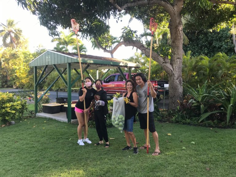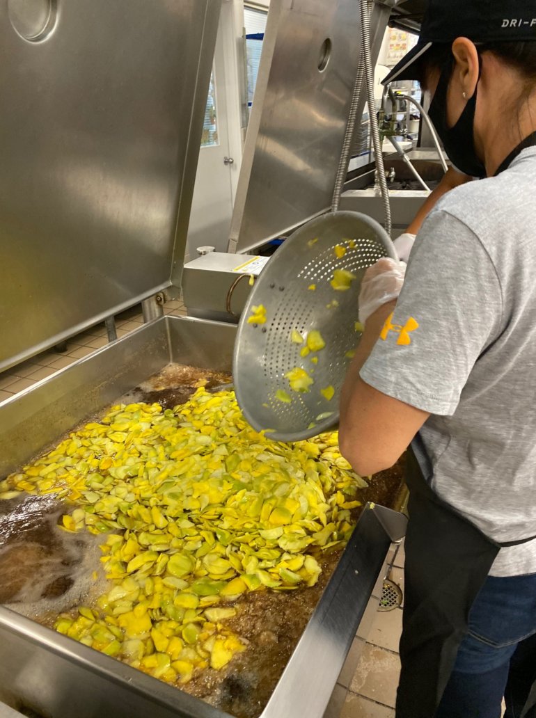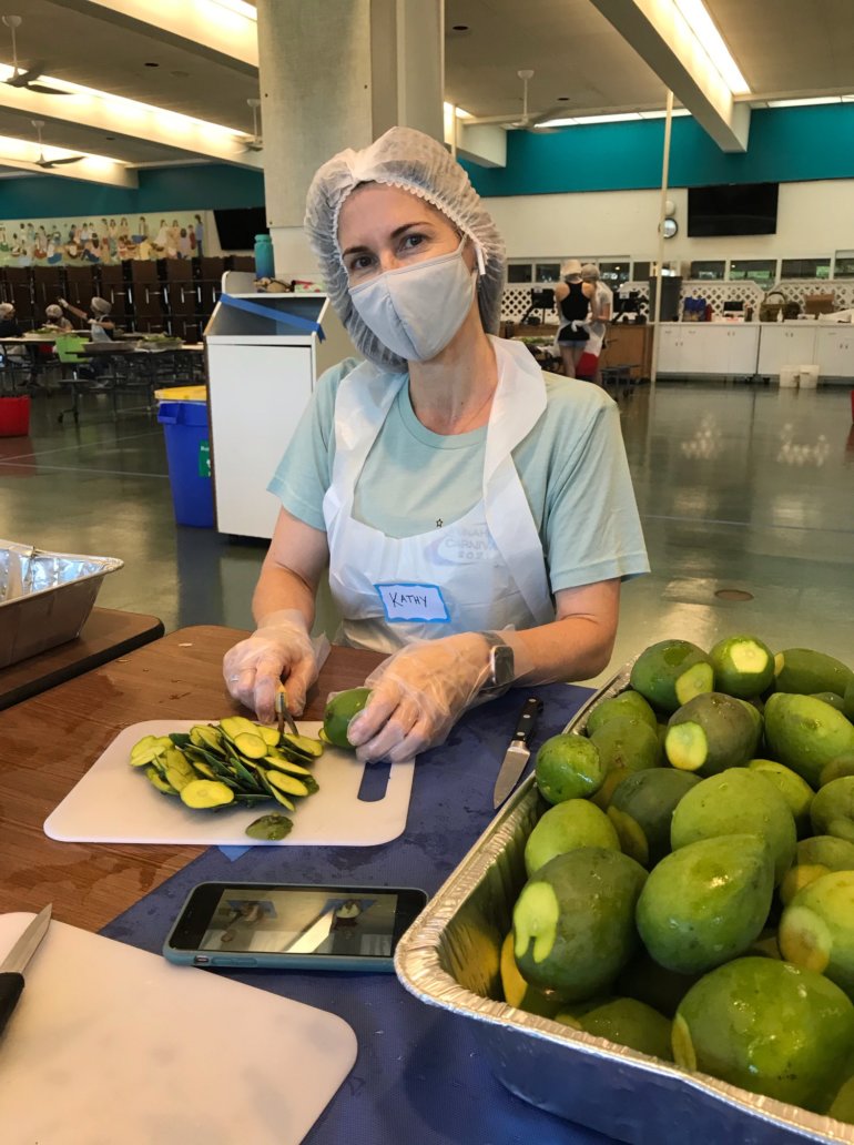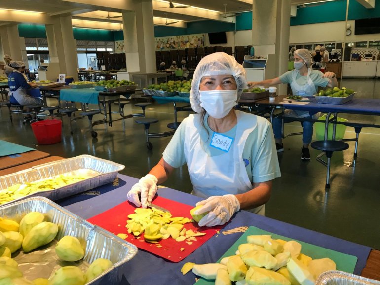 Throughout May and June, parent and student volunteers were busy picking donated green mangoes from the trees of families and friends of Punahou. Volunteers then washed, trimmed, peeled, chipped and salted the mangoes to get them ready to cook.