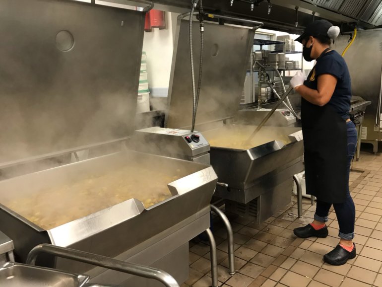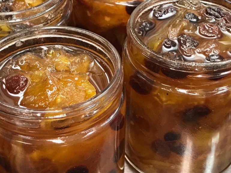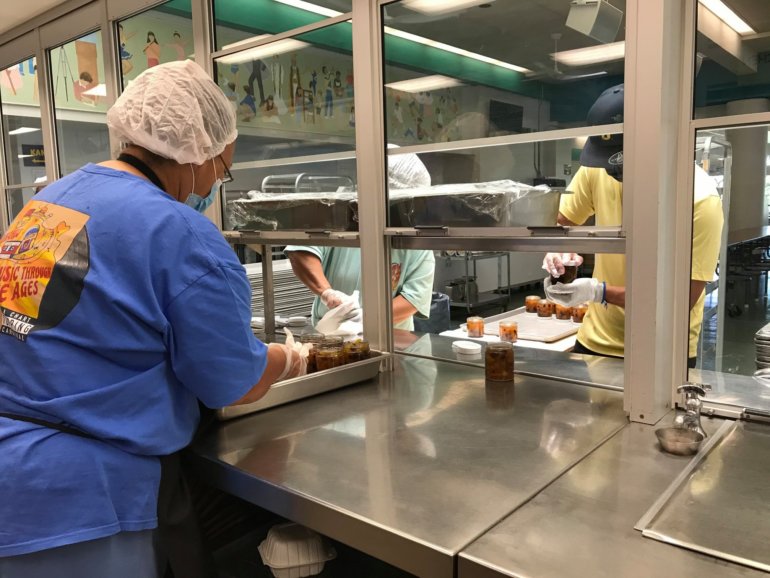 Since late June, PFA Carnival volunteers and Punahou’s cafeteria staff have been cooking the mixture of mangoes, onions, sugar, spices and vinegar to produce the tangy, sweet chutney, which is then jarred and labelled. In a typical year, 5,000 pounds of whole mangoes make for 8,000 jars of chutney.