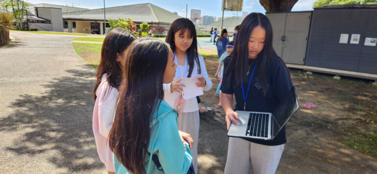 During recess, they survey classmates about their awareness of the Aloha+ Challenge and what they would like to learn more about. Students analyze the results first on their own and then with the help of AI.