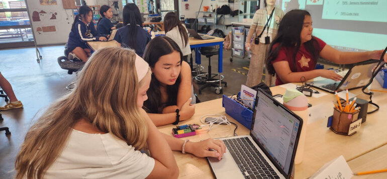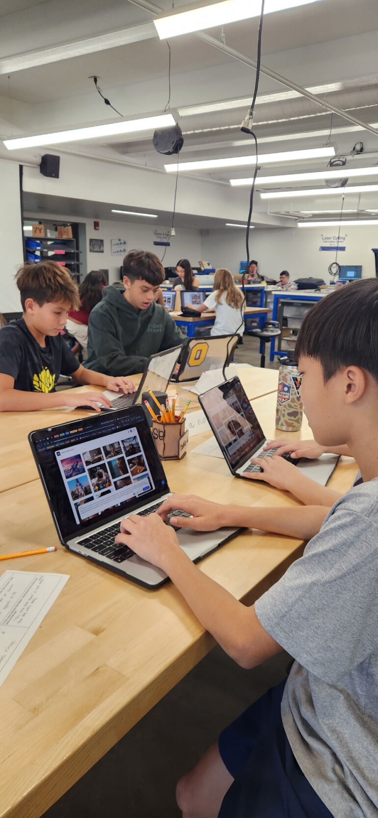 Each semester, Punahou seventh graders embark on a creative journey that culminates in a lively, interactive exhibit highlighting local and global sustainability initiatives. Along the way, students in Nozomi Ozaki’s Design Technology and Engineering course learn to conceptualize and create objects using professional software, laser cutters, sticker machines, 3D printers and perhaps the most intriguing tool of all, artificial intelligence. The goal, Ozaki says, is to help students use AI in meaningful and impactful ways.
