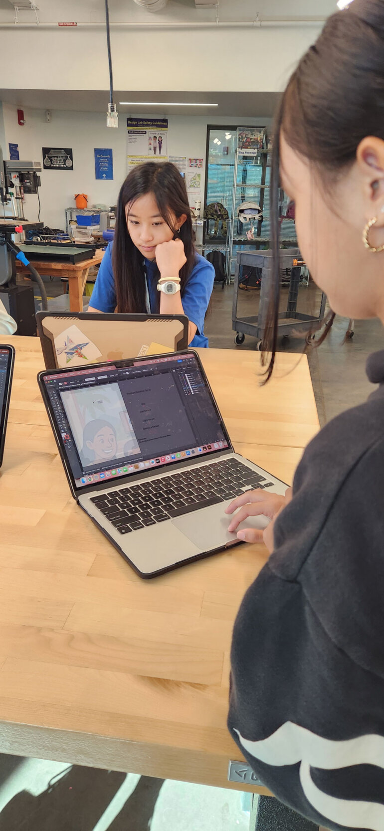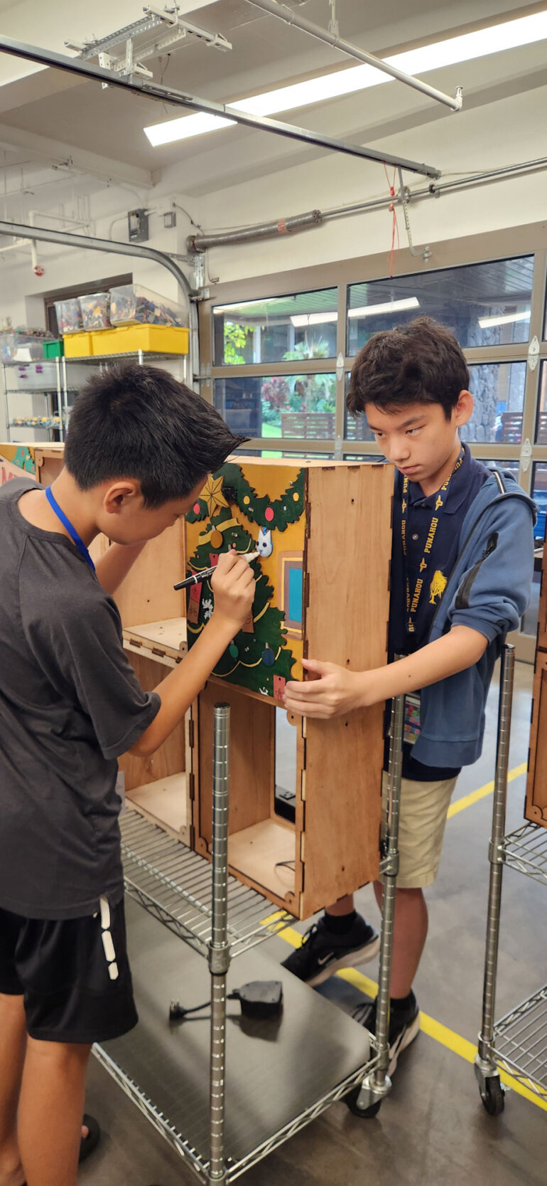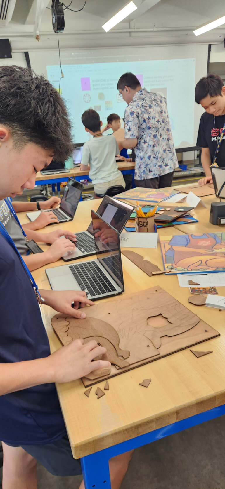 After choosing a theme, students break into small groups to collaboratively develop storyboard concepts. Ozaki creates a custom chatbot for each project, drawing from a curated bank of reliable resources. Students use the chatbot to ask questions, deepen their thinking and refine their ideas. With their newly honed prompting skills, they also ask AI to generate graphics, which they then reproduce on thin sheets of wood using the laser cutter.