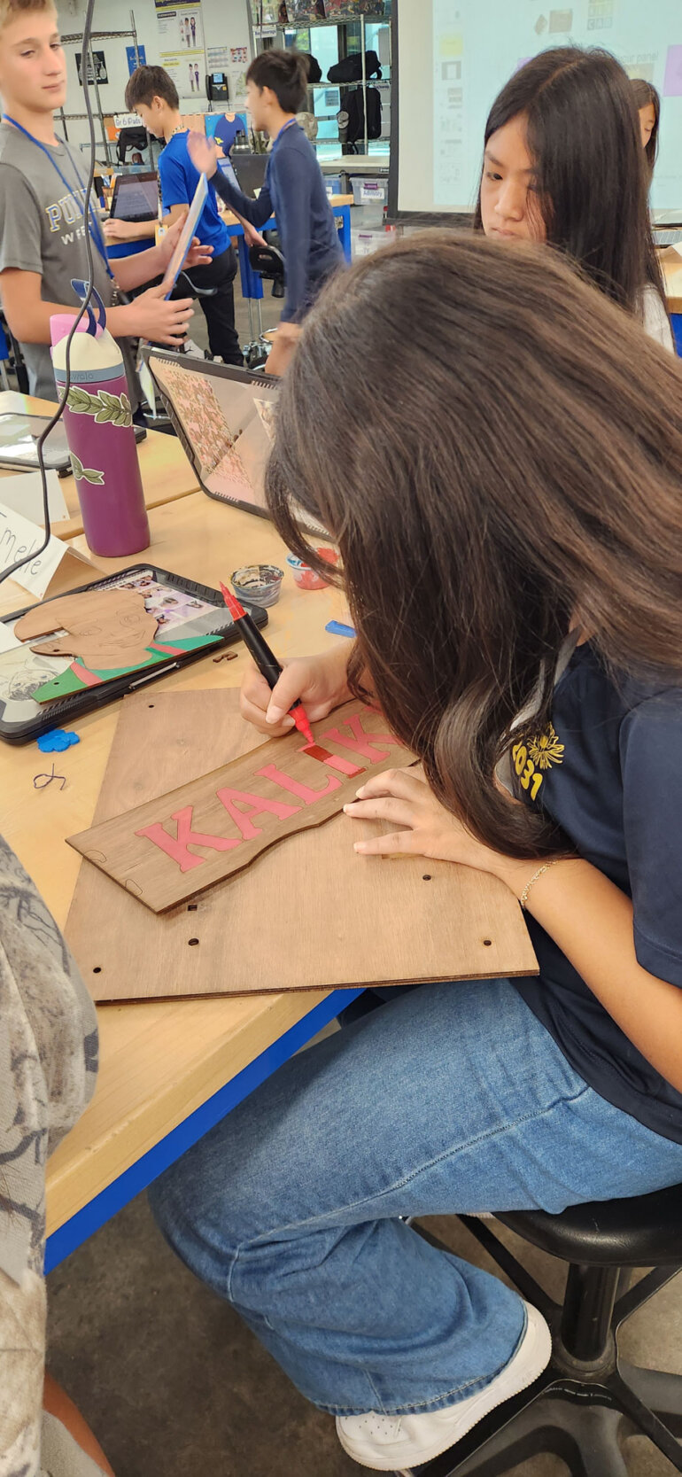 Once students master the process, the sticker machine produces an array of rainbow-colored designs. From there, the class advances to more sophisticated equipment, including the laser cutter and 3D printer. Using Adobe Illustrator, students design wooden keychains that are laser cut, then add embellishments by building 3D charms with Tinkercad.