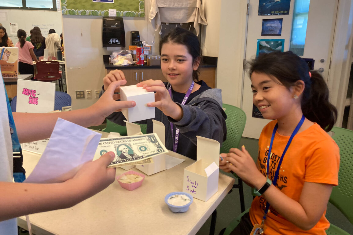 Working in teams of three or four, students brainstormed business concepts rooted in environmental awareness and sustainable practices. Each group drafted a business plan before visiting the Big Bucks Bank, where volunteer “bankers” evaluated proposals, approved loans, and kept careful ledgers. Nearby, volunteer “warehouse workers” managed the Wholesale Warehouse, offering a variety of raw materials and creative supplies – from essential oils and colorants to soy wax, soap bases and small trinkets for product customization.