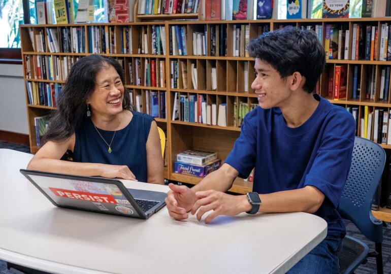 The partnership between students and teachers is more vital than ever, as they explore the new AI frontier. At Punahou, there is always dialogue and clear guidance to ensure this new technology is being used responsibly. Above: Joshua Chang ’28 with Punahou English Faculty Lara Mui ’88 Cowell.