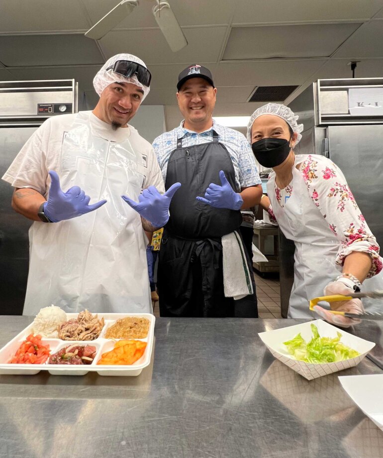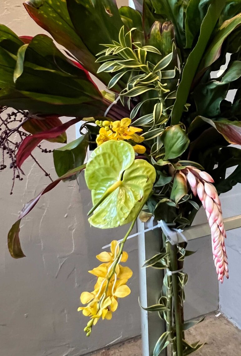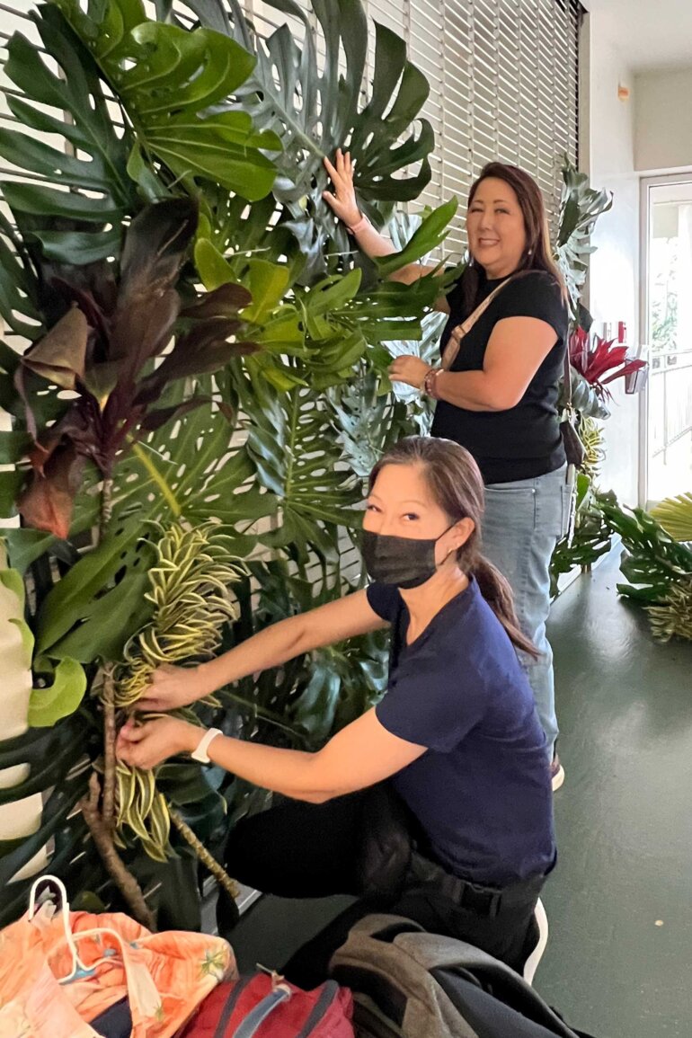 Our wonderful Grade 10 families donated all the foliage needed to decorate the cafeteria. This year we had monstera, palm, ti, laua‘e, and a variety of orchids, just to name a few. We had so many donations that we were able to decorate every table, the entryway, and two photo backdrops for the students to enjoy. Not just that, but our PFA Advisory Parents dedicated their whole night to volunteering including setting up and decorating, checking in students, serving ‘ono Hawaiian food, watching bags and belongings, and cleaning up the cafeteria.