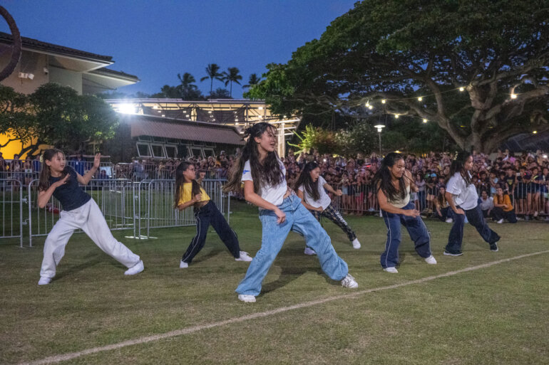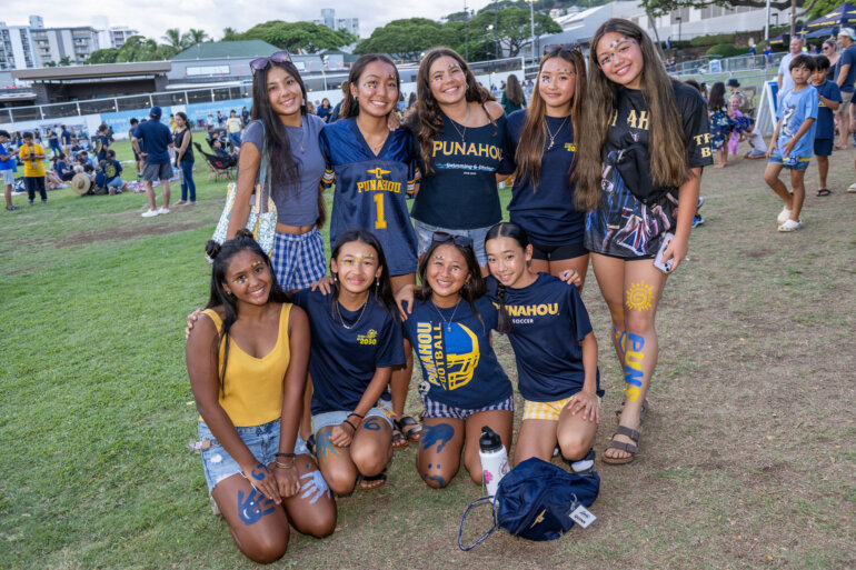 Punahou School’s annual Flaming “P” celebration drew students, families, faculty and alumni to Rice Field on Friday for an evening of school pride.