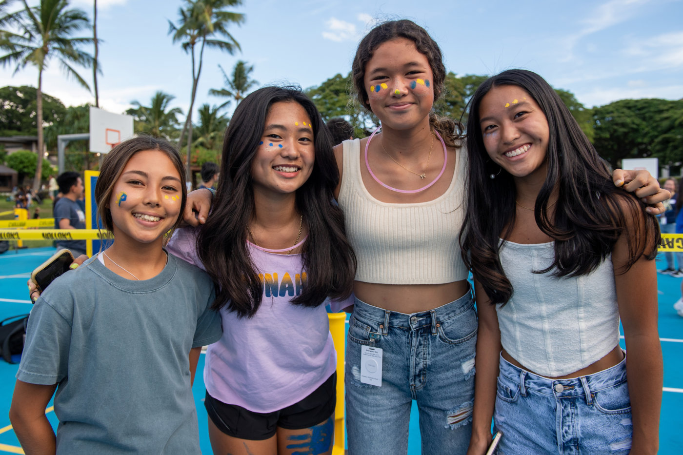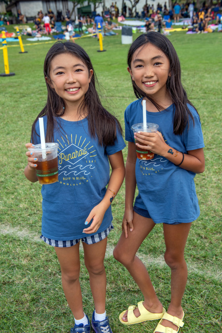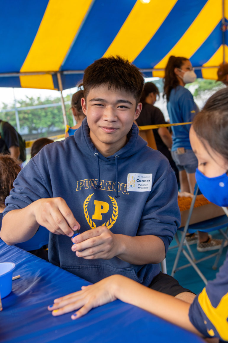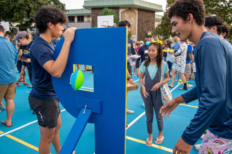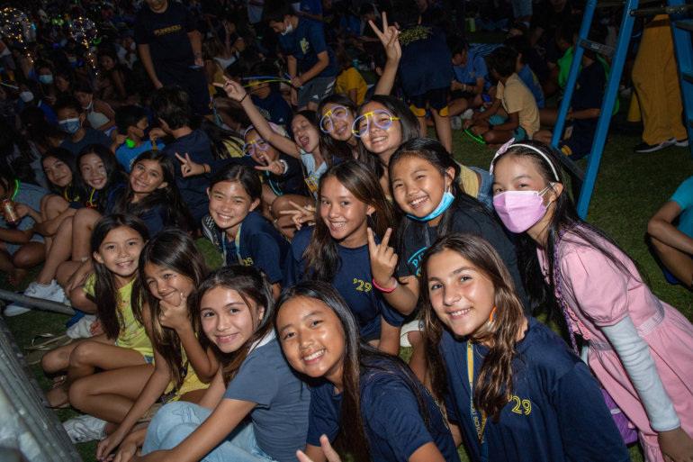 The evening included a chili dinner, keiki activities, live music and a pep rally. The evening capped off with athletes of the year Stryker Scales ’23 and Raya Nakao ’23 igniting the 20-foot tall “P” structure.
