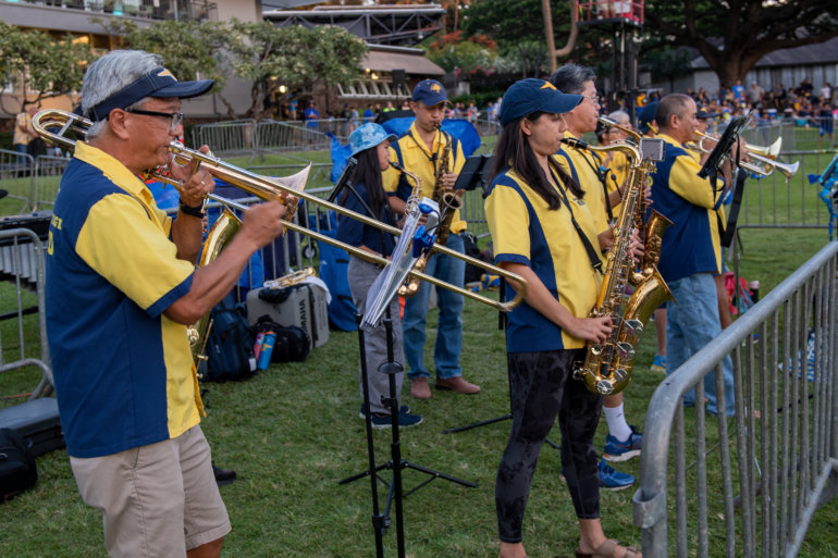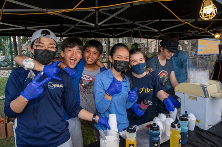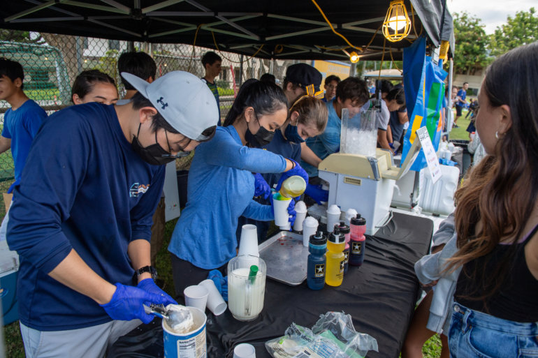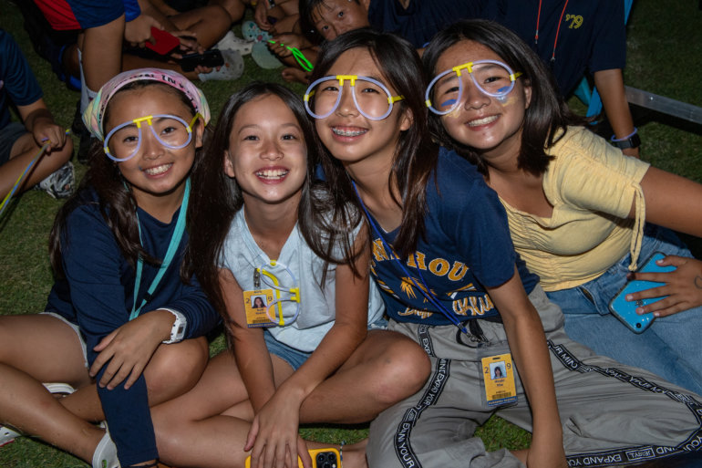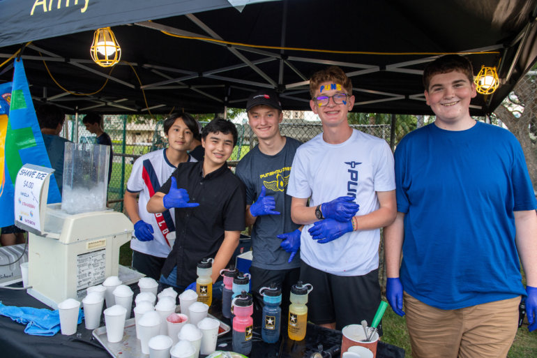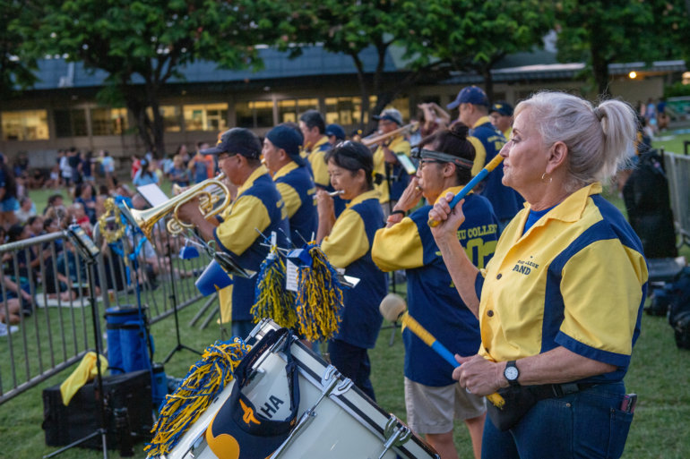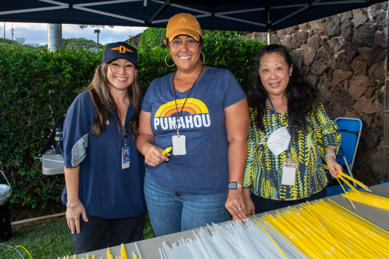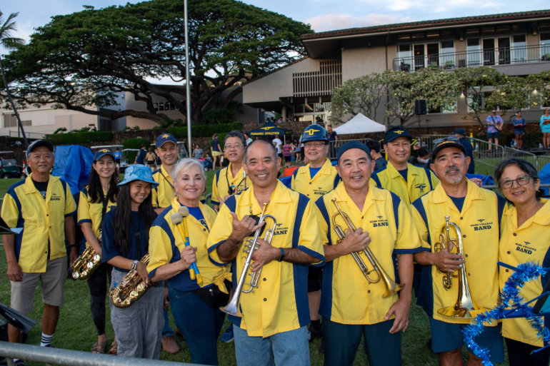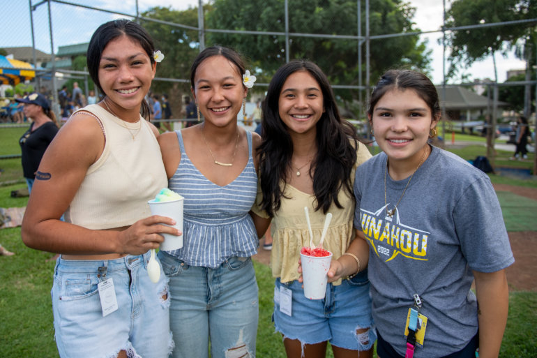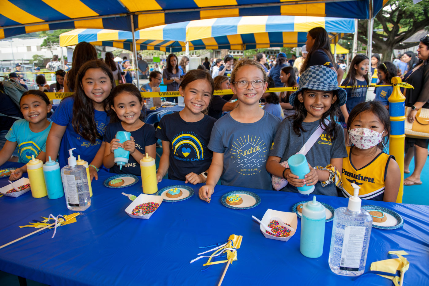 The evening included a chili dinner, keiki activities, live music and a pep rally. The evening capped off with athletes of the year Stryker Scales ’23 and Raya Nakao ’23 igniting the 20-foot tall “P” structure.