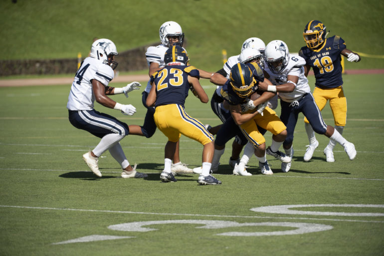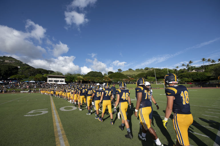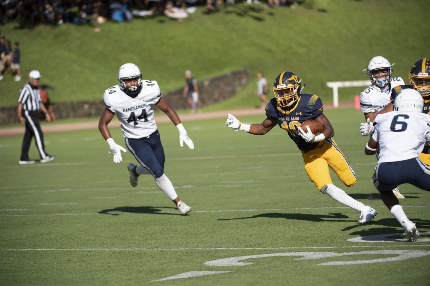 At Friday’s first home game of the season, the Punahou varsity football team defeated Kamehameha 15-5 and also made history. It was the first time since 1931 that the team played a varsity football game against Kamehameha on Alexander Field.