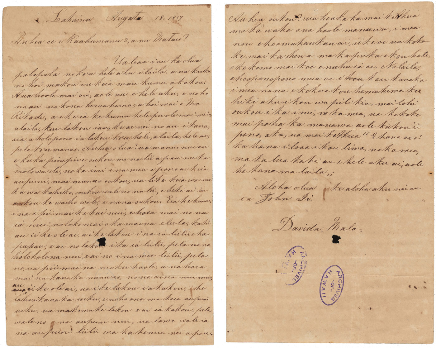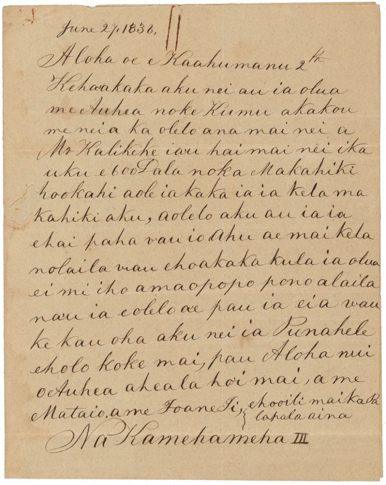 3 Translation by Hawai‘i State Archives (partial): “My dear Kaahumanu, I wish to explain to you and Auhea about our teacher. Mr. Richards told me that the salary would be $600.00 a year, he does not know about the year after. I told him I must let Oahu know of it and he consented, so I am letting you know about this. You must therefore think over the proposition and I will inform him of your intentions.”