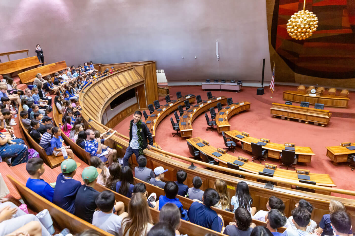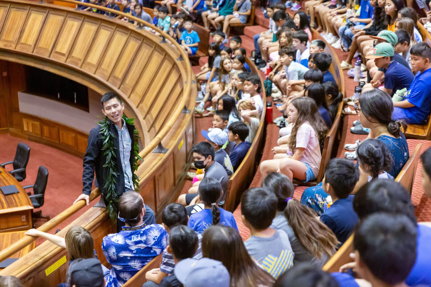 The students met with Rep. Jackson Sayama ’15, who represents District 21 and is one of Hawai‘i’s youngest elected officials. The Punahou graduate answered questions about working within the House of Representatives and shared his journey from participating in Punahou’s Damon Speech as a student to proposing legislation in the State House in less than 10 years of graduating.