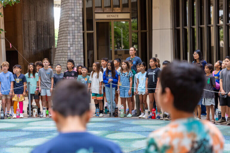 Fourth graders recently embarked on an exciting educational trip to Hawai‘i’s State Capitol, where the entire grade had the chance to engage with local leaders, history and art. Coordinated through Punahou’s Davis Democracy Initiative (DDI), the visit included hands-on activities and conversations designed to bring state government and civic engagement to life.