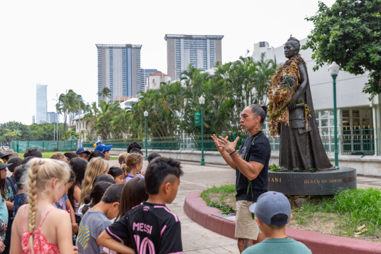 At the Queen Lili‘uokalani Memorial, students participated in an augmented reality experience created by the Honolulu Theatre for Youth (HYT), which showcased multiple perspectives on Hawaiian history – a Native Hawaiian practitioner, a tourist, a local youth and a historical figure from the 1890s speaking to the Queen. HTY cast members Moses Goods and Loko Lipscomb also spent time engaging with students about the complex histories held within the memorial.