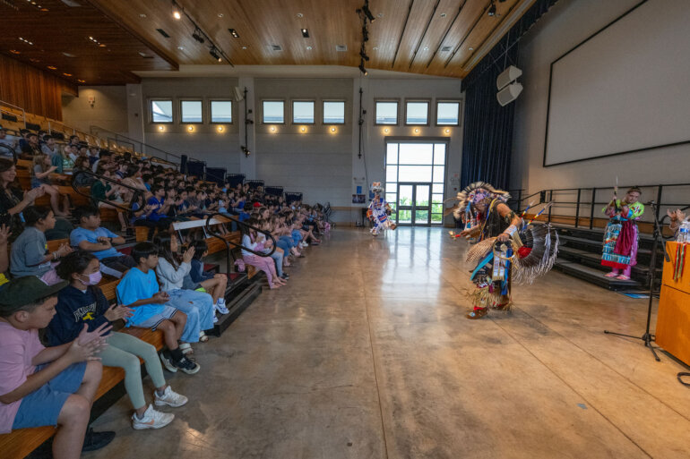 Punahou fourth graders gathered in Twigg-Smith Pavilion for a vibrant and meaningful Powwow presentation by the Ho‘opili Tribal Council.