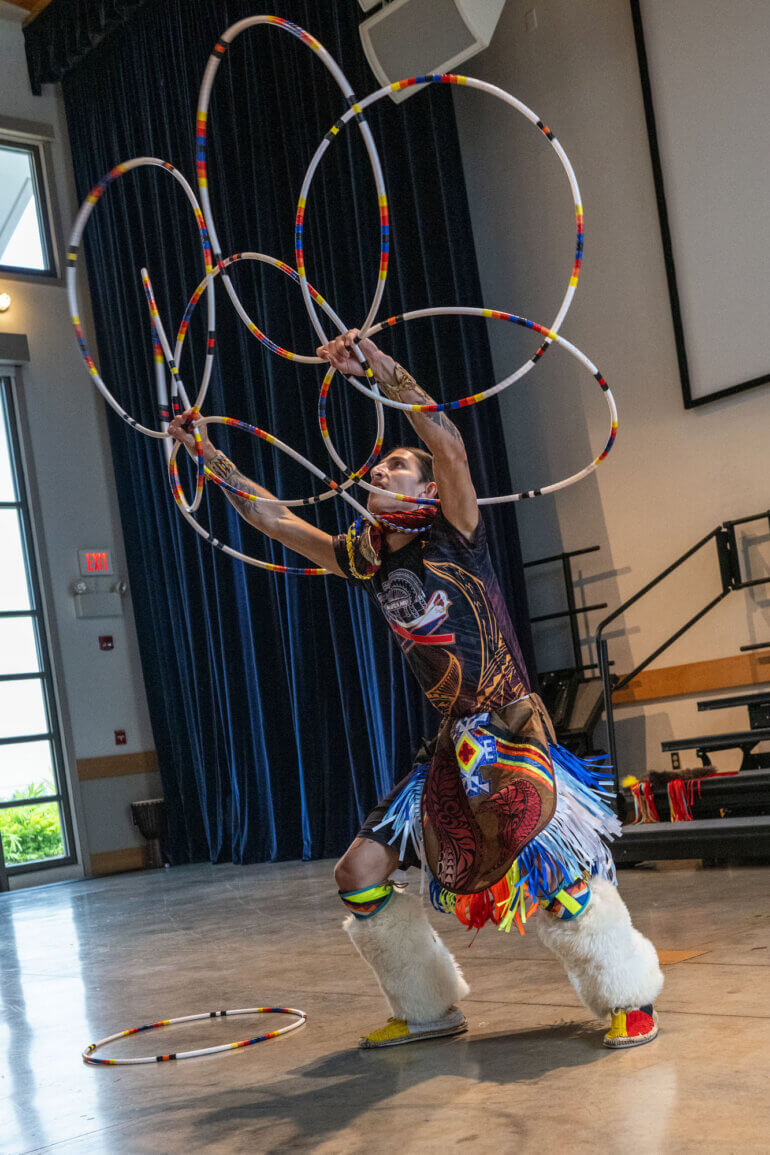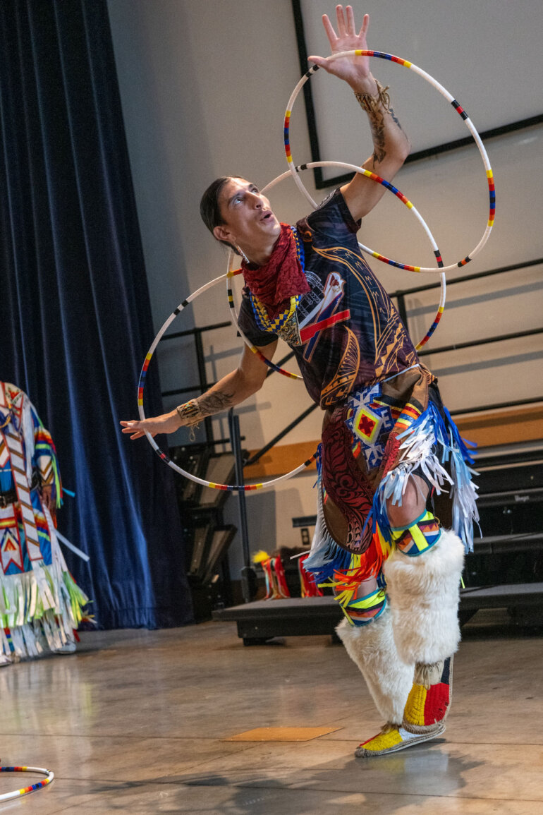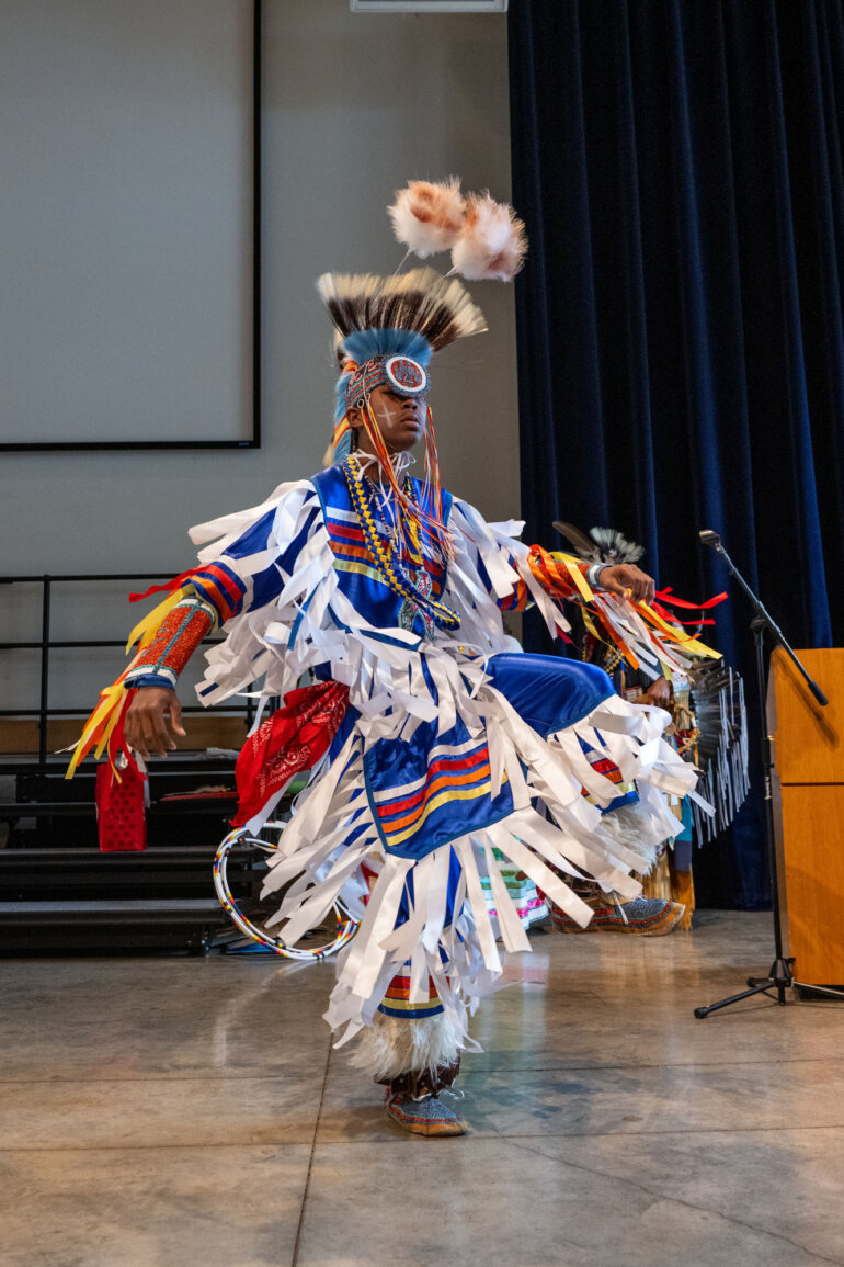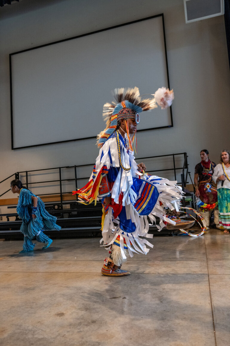 The Ho‘opili Tribal Council’s visit brought this learning to life. Performers including Nathaniel Bearsheart captivated students with traditional hoop dancing, while Kai Bevett, Honolulu Intertribal Powwow 2026 Junior Teen Warrior, performed traditional dances alongside his father, Dr. David Bevett. Other members also shared dance, regalia and storytelling, offering students a firsthand look at living cultural traditions.
