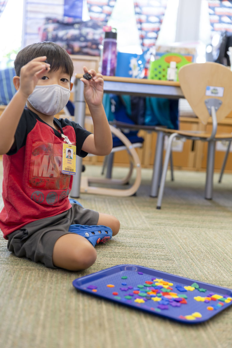 The kindergartners then sorted a pile of buttons by shape, color or number of button holes, then challenged a partner to guess how they were sorted. The children also posed the question to their families via an online sharing platform. “Students this age are really engaged by this game-based, hands-on approach,” Arakawa explained.
