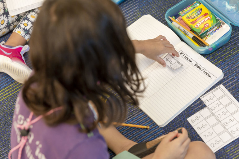 In Nishikawa’s second grade class, students broke out in different groups to focus on a variety of activities that reinforced how addition and subtraction are related. One group was outside playing a game, others worked on iPads, while another group was mixing and matching equations cut from a worksheet.
