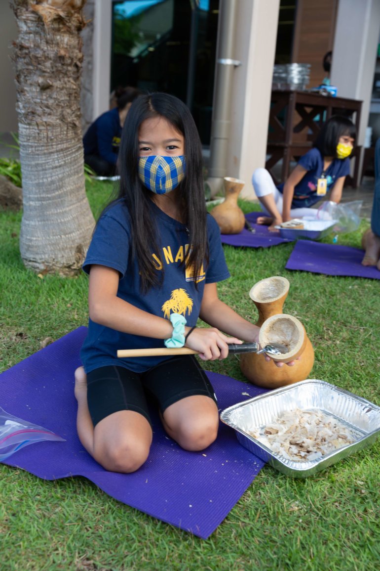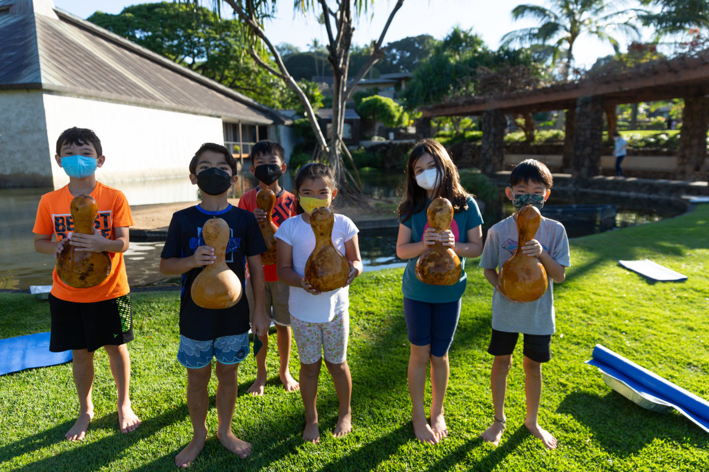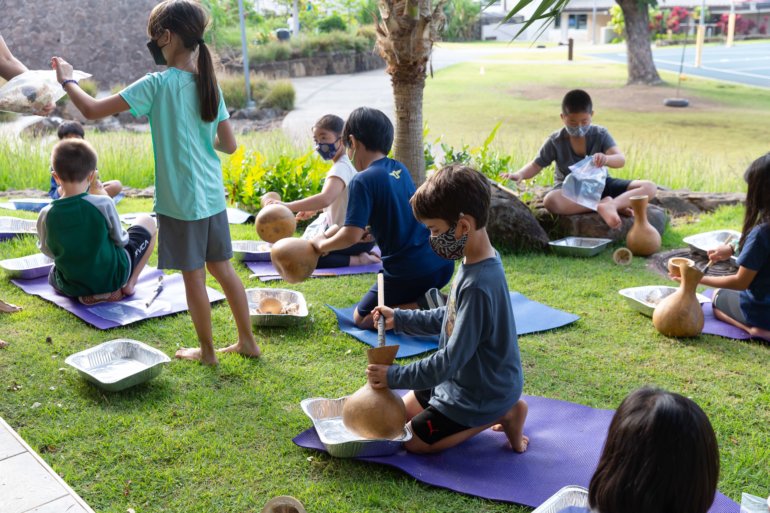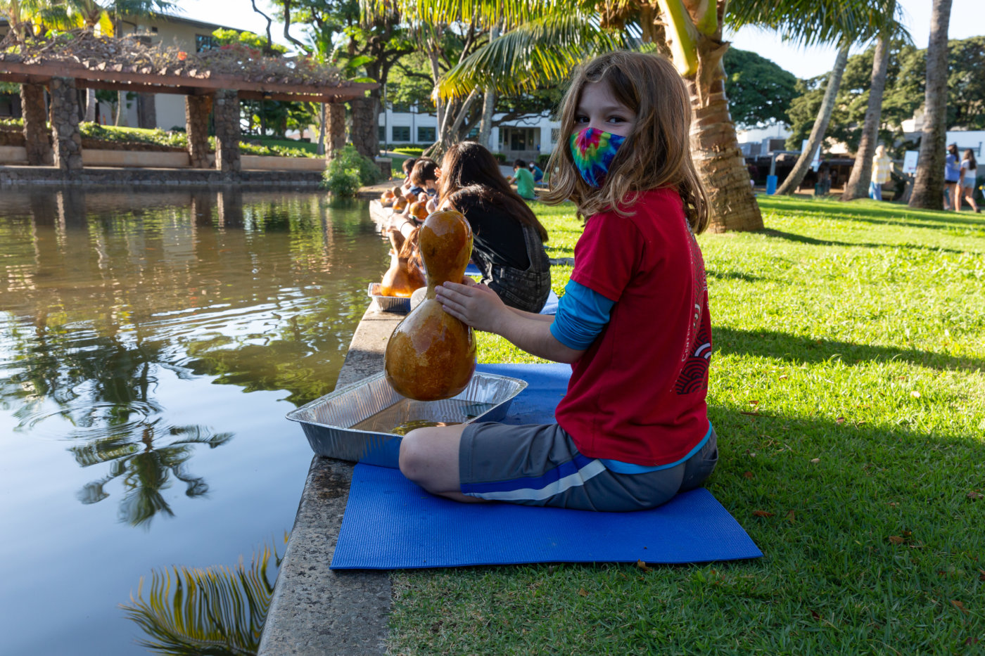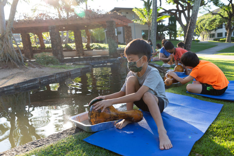 Third graders in Luana Yee’s class polished their ipu at the Lily Pond. Other third graders cleaned out the inside of their gourds outside the classroom. Students are prepping their instruments for May Day hula and mele, and as part of the third grade focus on Hawaiian studies.