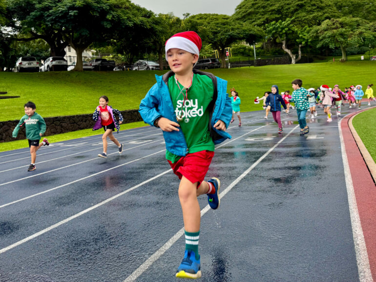 The next day, the kindergartners spread holiday cheer by singing Christmas carols to the first graders before cheering them on at the Jingle Bell Run during PE class. Despite the rainy weather, the first graders enthusiastically ran the track, showing plenty of energy and having tons of fun.