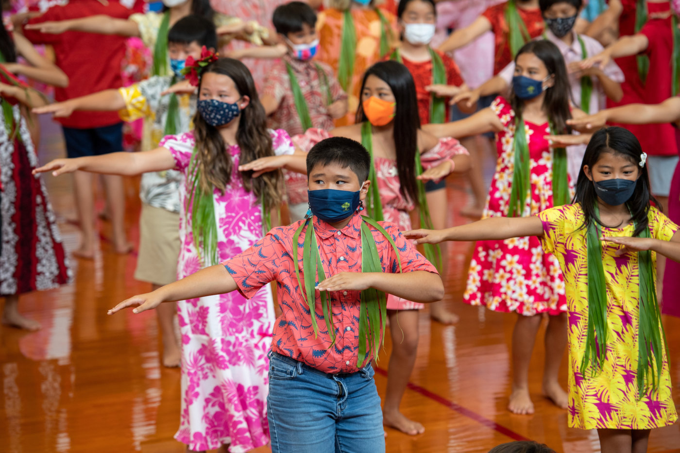 For the K – 5 May Day Program, Kimo Keaulana coordinated the creation of 750 tī leaf (lāʻī) lei for students in grades 2 – 5. “I thought it was a good idea for our keiki to wear these lei, and I wanted to give them something that I had made,” said the ‘Ike Hawai‘i faculty and Kumu Hula.