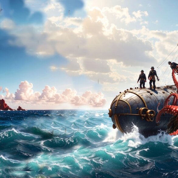 To illustrate the process his Grade 8 students went through, Art Faculty Hugh Mosher created his own book cover inspired by “Twenty Thousand Leagues Under the Sea”