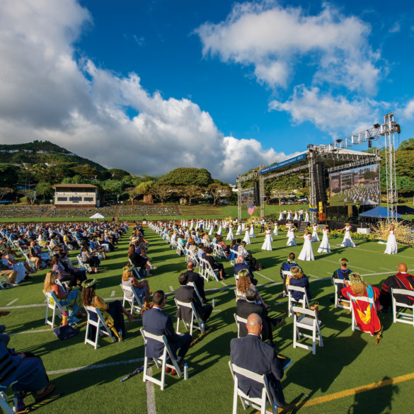 Under blue skies and roving clouds, members of the Class of 2021 danced hula to “Nani Mānoa,” as parents watched from Alexander Field.