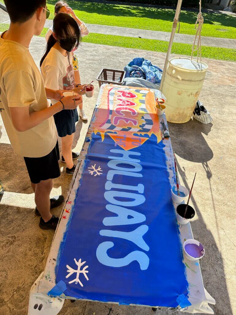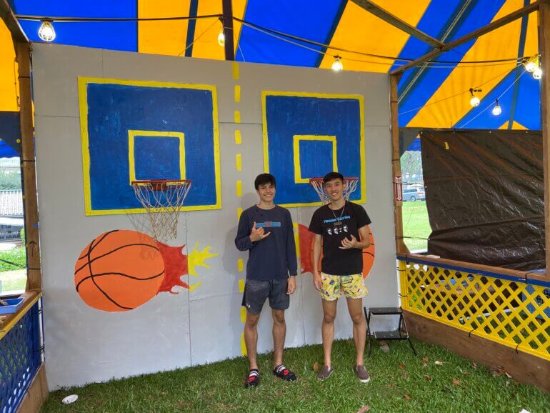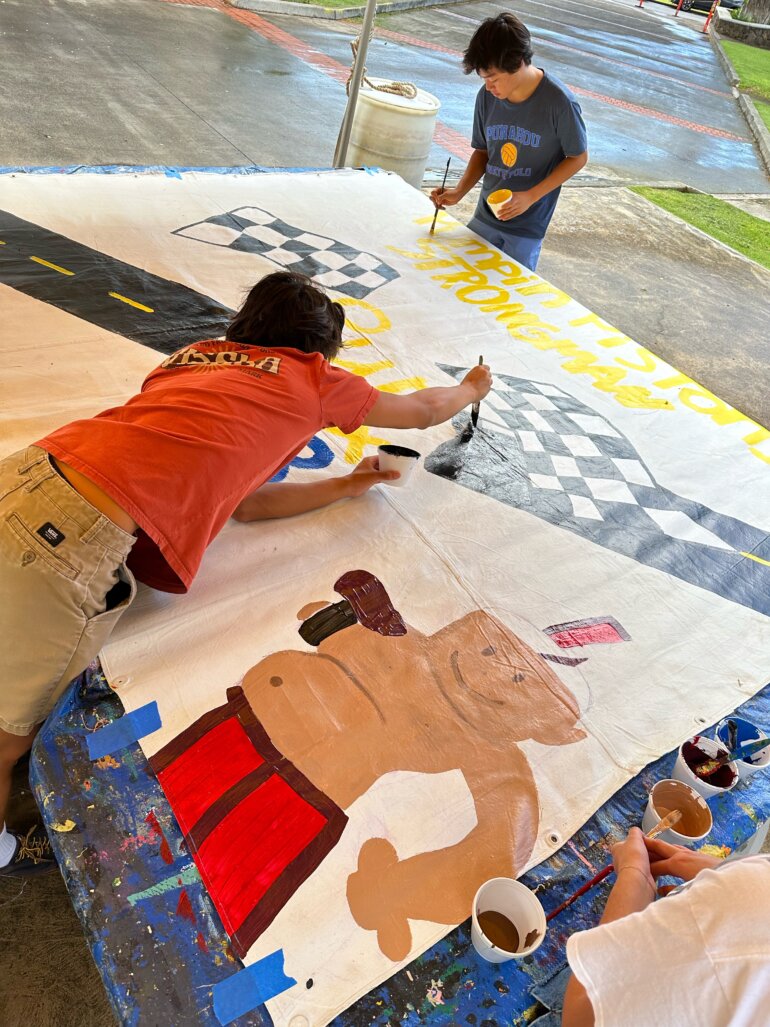 On the other hand, Student Booth Chairs, with the assistance of the Sign Painting Student Chairs, were in charge of their own creative signage and promotional efforts. Beginning in the fall and up until Carnival, Sign Painting Parent and Student Booth Chairs hosted different groups of students on weekends to help them create backdrops and banners for their booths. Students wrote their own unique titles based on the booth’s product and this year’s theme, sketched the names and designs, and submitted this to their deans for approval. The students then laid out and transferred their designs onto larger banners and painted the final products.