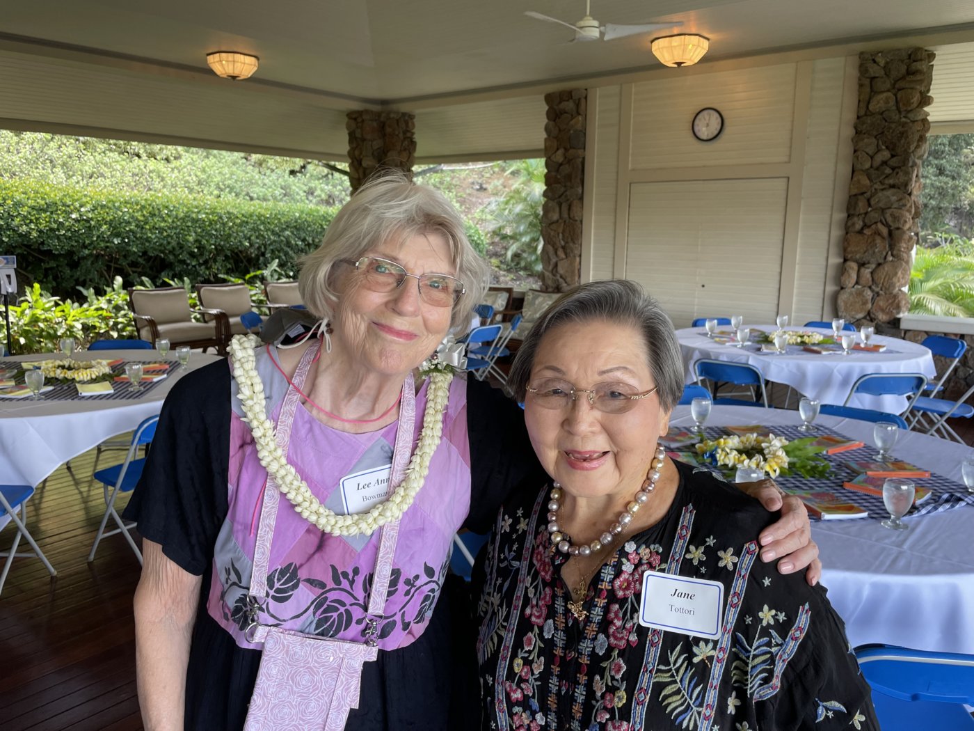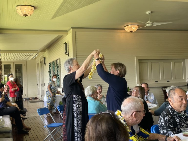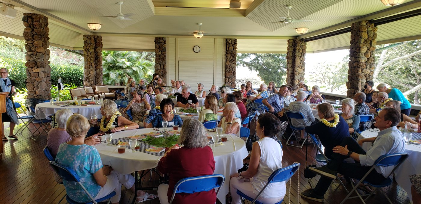 Punahou’s former faculty and staff reunited for fellowship and lunch at the President’s Pavilion on Wednesday. President Mike Latham ’86 invited the newest retirees from each table to give a lei to the longest retirees, and the attendees enjoyed sharing laughs and memories.