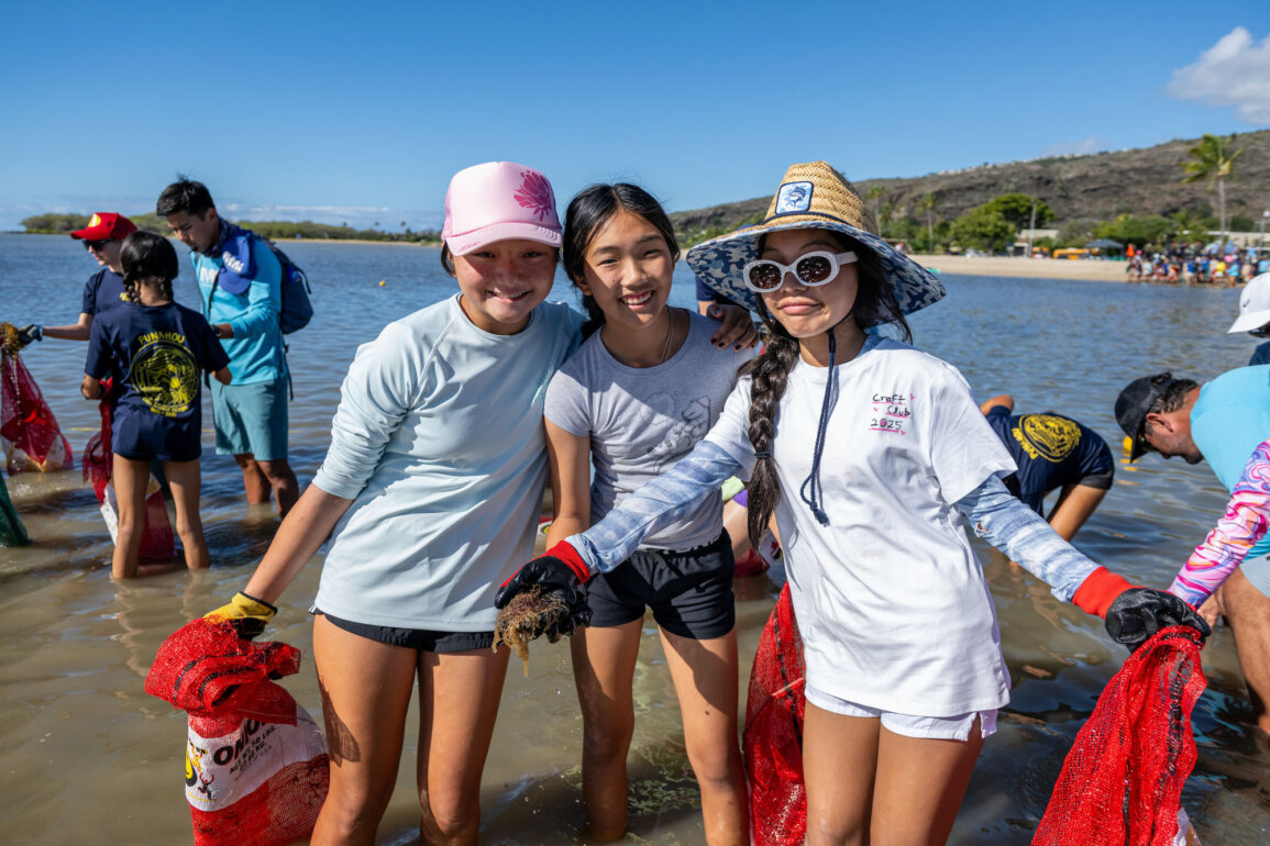 In partnership with Mālama Maunalua, students helped remove invasive limu (algae) from about 1,600 square meters of nearshore habitat. The collected limu was weighed and transported to a nearby farm for reuse. Their efforts supported ongoing work to restore healthy native seagrass, limu and ko‘a (coral) throughout the bay.