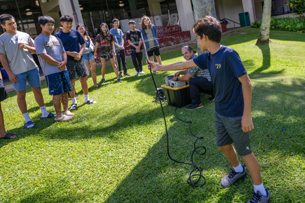 When recent graduate Ethan Carter ’25 set out to design his final project in Engineering V last year, he focused on a challenge close to home: protecting Hawai‘i’s coconut trees from the destructive rhinoceros beetle. His solution – a solar-powered neem oil, soap and water solution dispenser – combined sustainable engineering with real-world environmental impact. By automating the release of a natural pesticide to the tops of trees, Carter’s design offered a practical and eco-friendly way to help curb infestations without harming the ecosystem.