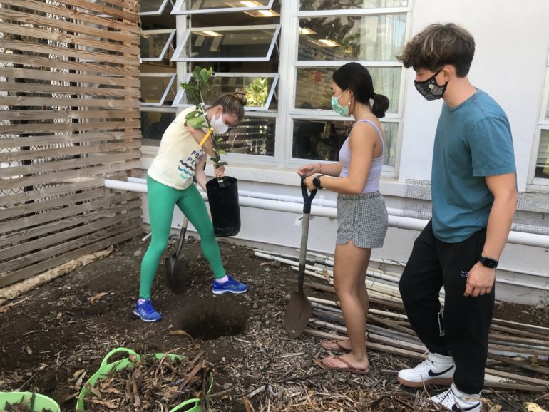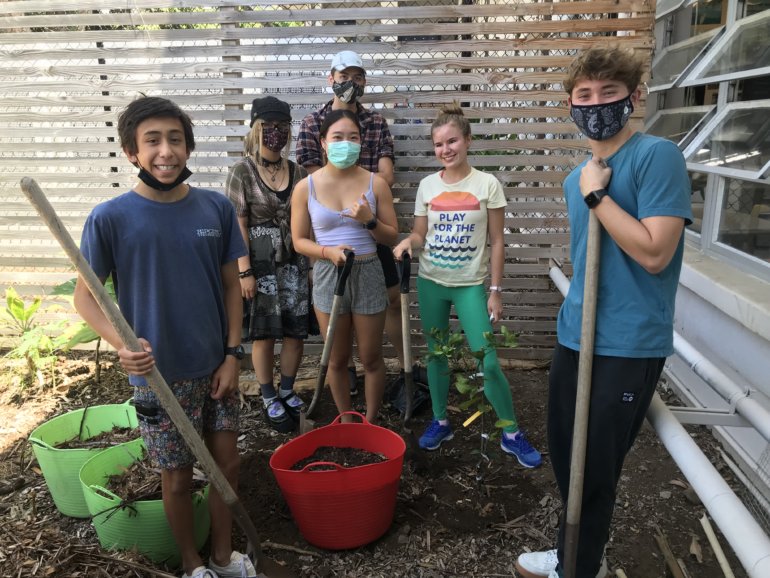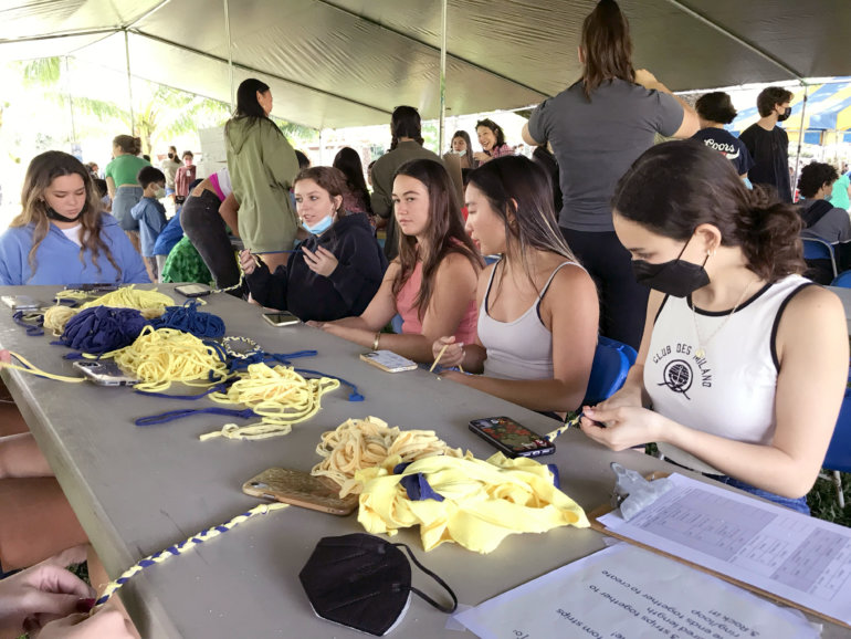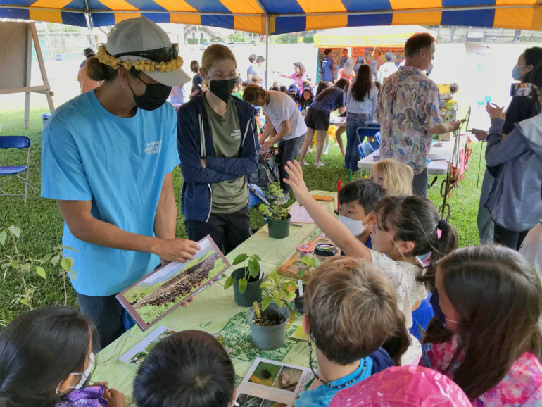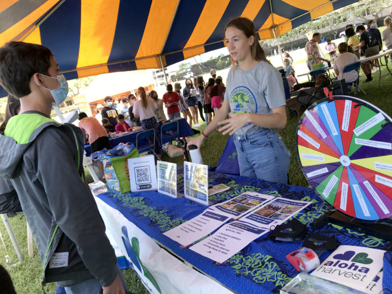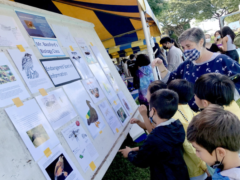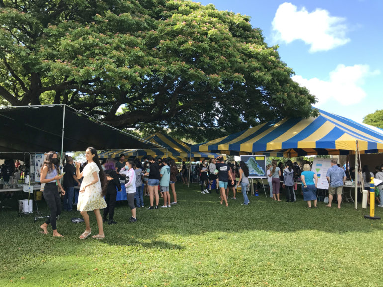 Open to students of all ages, the fair included booths with representatives from the Audubon Society to talk about preserving Manu-o-Kū (white tern) nesting sites, Aloha Harvest, who discussed redesigning local food distribution networks, and Nā Kama Kai, who presented on ocean safety. Academy students highlighted their sustainable projects, such as a design for a community refrigerator and a program to bring reclaimed flowers to kūpuna in care homes.